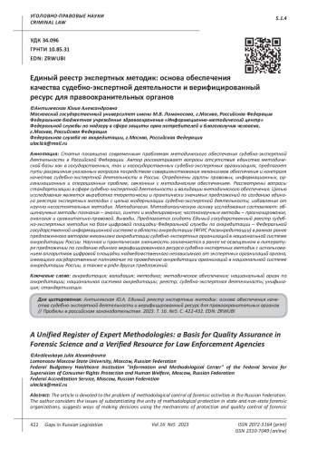 Статья посвящена современным проблемам методического обеспечения судебно-экспертной деятельности в Российской Федерации. Автор рассматривает вопросы отсутствия единства методической базы как в государственных, так и негосударственных судебно-экспертных организациях, предлагает пути разрешения указанных вопросов посредством совершенствования механизмов обеспечения и контроля качества судебно-экспертной деятельности в России. Определены группы правовых, информационных, организационных и операционных проблем, связанных с методическим обеспечением. Рассмотрены вопросы стандартизации в сфере судебно-экспертной деятельности и валидации методического обеспечения. Целью исследования является выработка теоретически и практически значимых предложений по созданию единого реестра экспертных методик с целью модернизации судебно-экспертной деятельности, избавления от научно несостоятельных методик. Методология. Методологическую основу исследования составляют: общенаучные методы познания - анализ, синтез и моделирование; частнонаучные методы - прогнозирование, аналогия и сравнительно-правовой. Выводы. Предлагается создать Единый государственный реестр судебно-экспертных методик на базе цифровой площадки Федеральной службы по аккредитации - Федеральной государственной информационной системе в области аккредитации (ФГИС Росаккредитации) в рамках ранее предложенного автором механизма аккредитации судебно-экспертных организаций в национальной системе аккредитации России. Научная и практическая значимость заключается в ранее не освещенном в литературе предложении по созданию единого верифицированного ресурса судебно-экспертных методик с использованием алгоритмов цифровой площадки надведомственного независимого от экспертных организаций органа, имеющего государственные полномочия по проведению аккредитации организаций в национальной системе аккредитации России, а также в ряде других предложений.