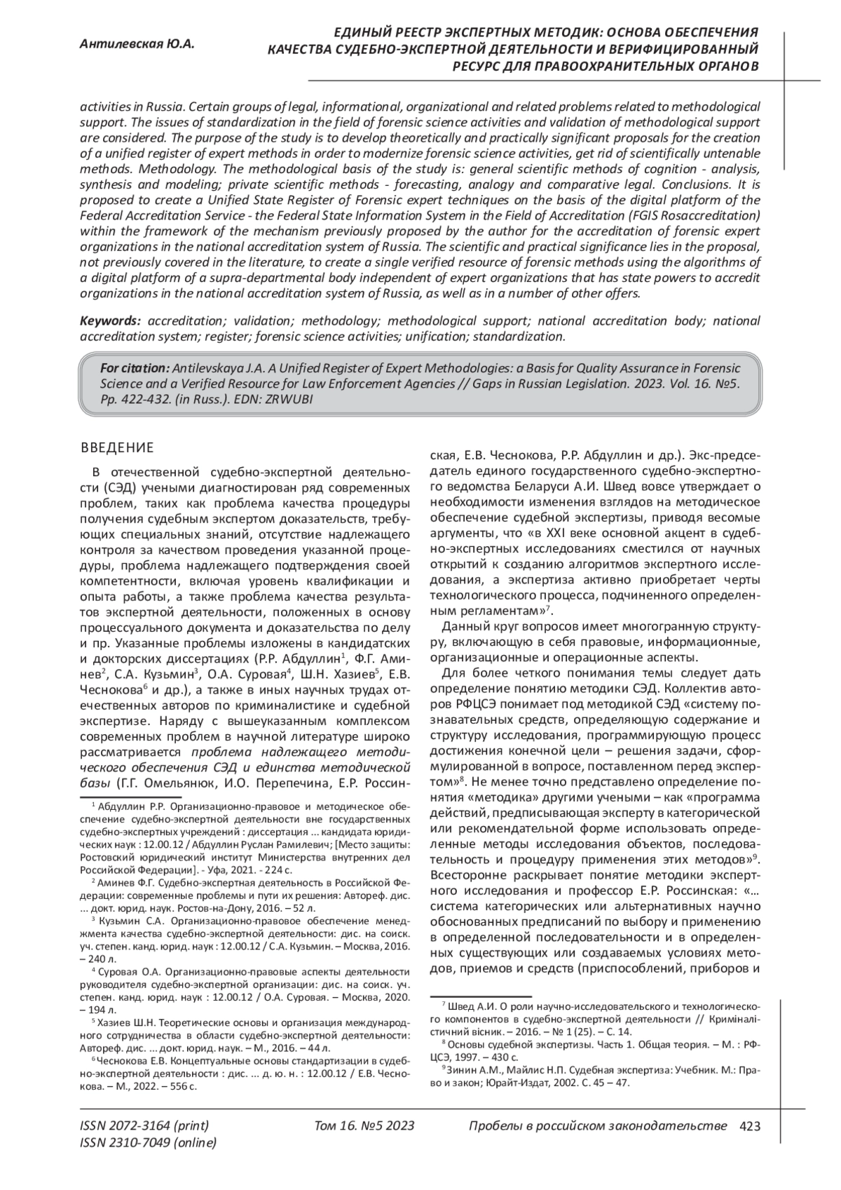 Antilevskaya Y.A. National system of accreditation of Russia - a legal way to improve domestic forensic expertise // Gaps in Russian legislation. 2022. № 6. P. 264-274. EDN: ZLVAFP