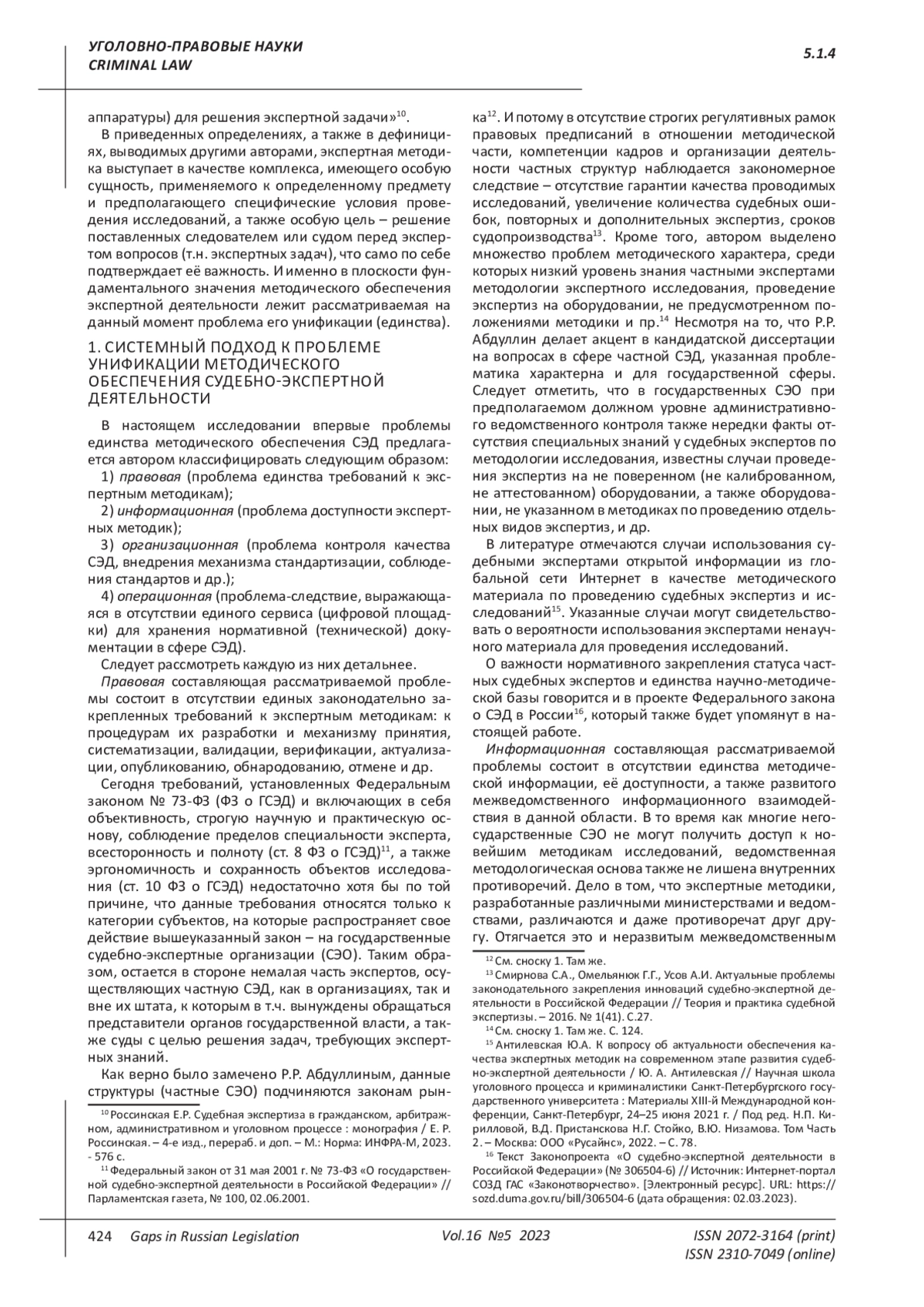 Целью исследования является обзор современных особенностей методического обеспечения судебно-экспертной деятельности вне государственных судебно-экспертных организаций Российской Федерации и предложения по повышению уровня этого обеспечения, в том числе путем внедрения экспертных методик, разработанных сотрудниками негосударственных судебно-экспертных организаций и учеными вузов. Тема исследования актуальна вследствие того, что в условиях продолжающегося совершенствования судопроизводства в Российской Федерации обострились проблемы его экспертного обеспечения, особенно, в сфере внедрения новых инновационных методов исследования в проведении судебных экспертиз вне государственных судебно-экспертных организаций. Предметом исследования выступают особенности разработки, валидации, апробации и внедрения новых экспертных методик в практическую экспертную деятельность. Выводы. В результате исследования доказана недостаточность оснащения современными экспертными методиками, в том числе, ограниченный доступ к ним экспертов, работающих вне государственных судебно-экспертных организаций, что приводит к необоснованным, в отдельных случаях - к недостоверным выводам. Показаны возможности экспертов негосударственных судебно-экспертных организаций и ученых вузов по разработке инновационных методов и экспертных методик. Проанализированы причины недостаточного внимания государственных судебно-экспертных организаций к таким методическим разработкам. Доказана важность изучения проблем методического обеспечения судебно-экспертной деятельности таких экспертов и разработка путей их решения в целях улучшения судебно-экспертной деятельности и повышения качества судопроизводства.