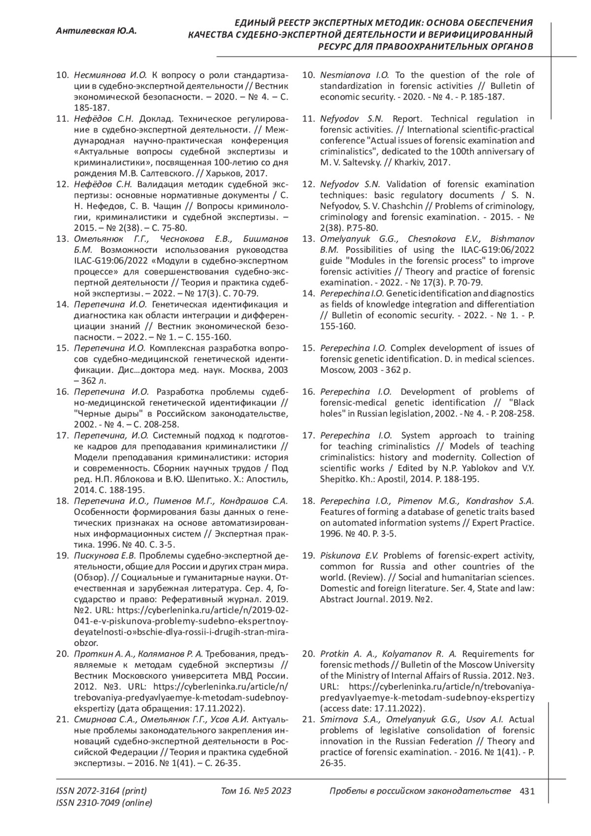 10. Несмиянова И.О. К вопросу о роли стандартизации в судебно-экспертной деятельности // Вестник экономической безопасности. - 2020. - № 4. - С. 185-187. EDN: PTMKBD