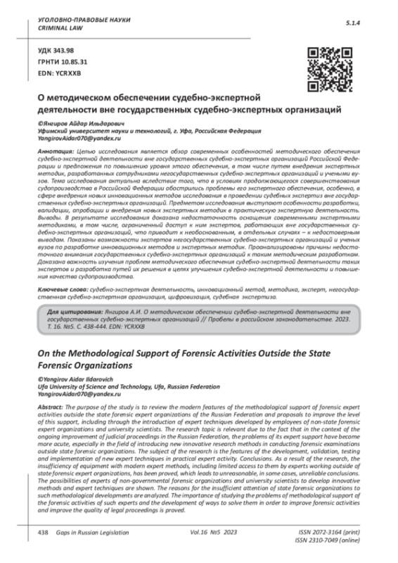 ЯНГИРОВ А. И. О МЕТОДИЧЕСКОМ ОБЕСПЕЧЕНИИ СУДЕБНО-ЭКСПЕРТНОЙ ДЕЯТЕЛЬНОСТИ ВНЕ ГОСУДАРСТВЕННЫХ СУДЕБНО-ЭКСПЕРТНЫХ ОРГАНИЗАЦИЙ // ПРОБЕЛЫ В РОССИЙСКОМ ЗАКОНОДАТЕЛЬСТВЕ. 2023. Т. 16 № 5