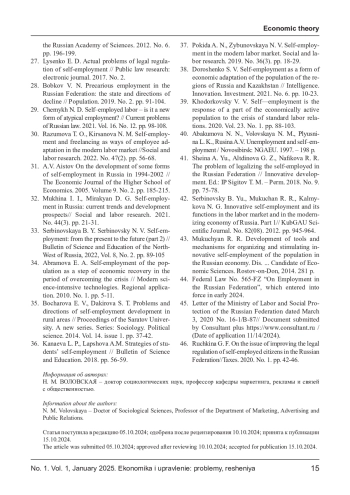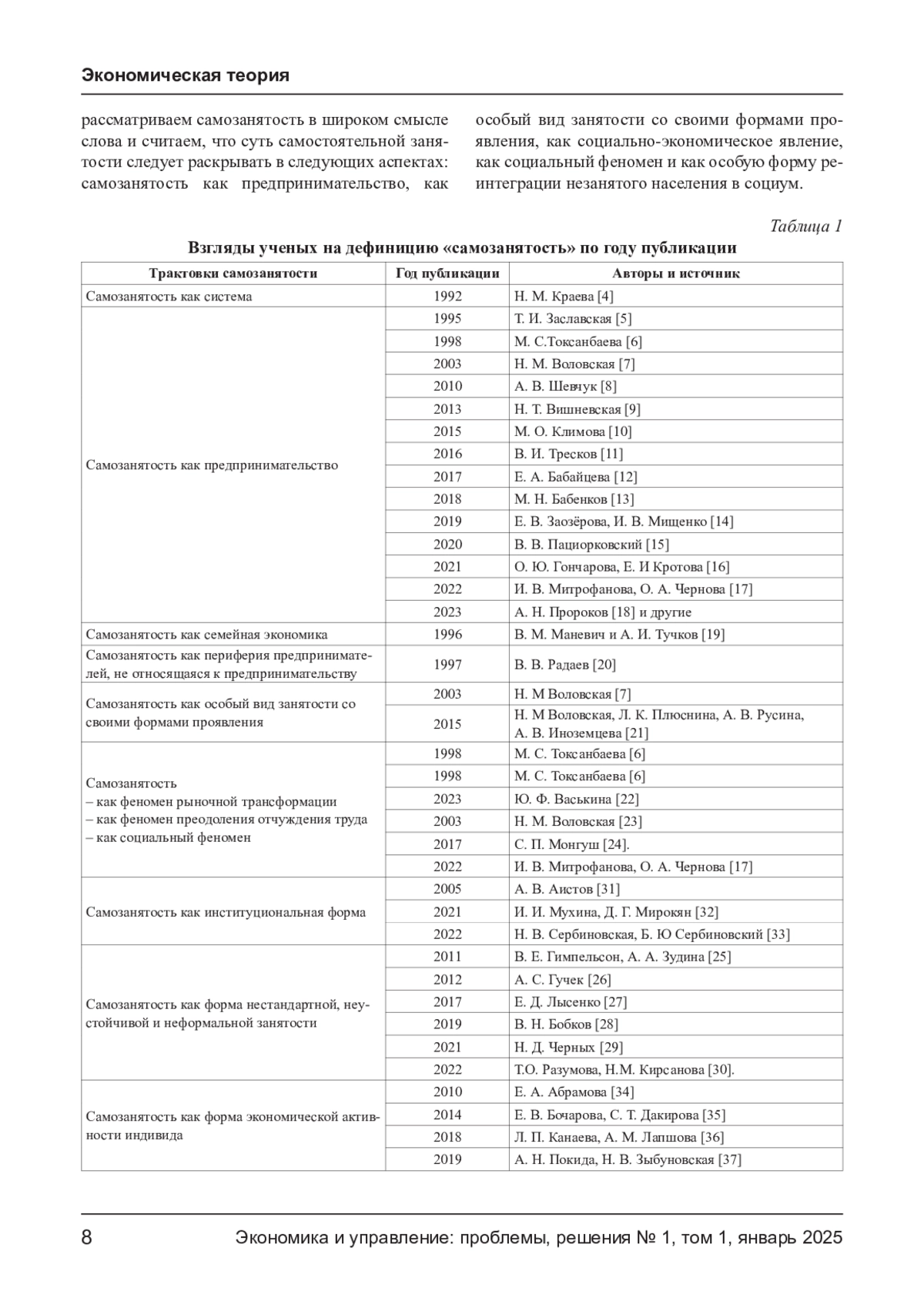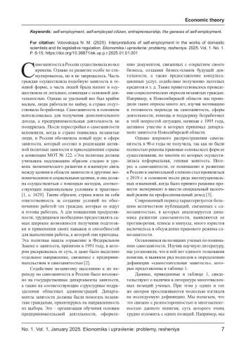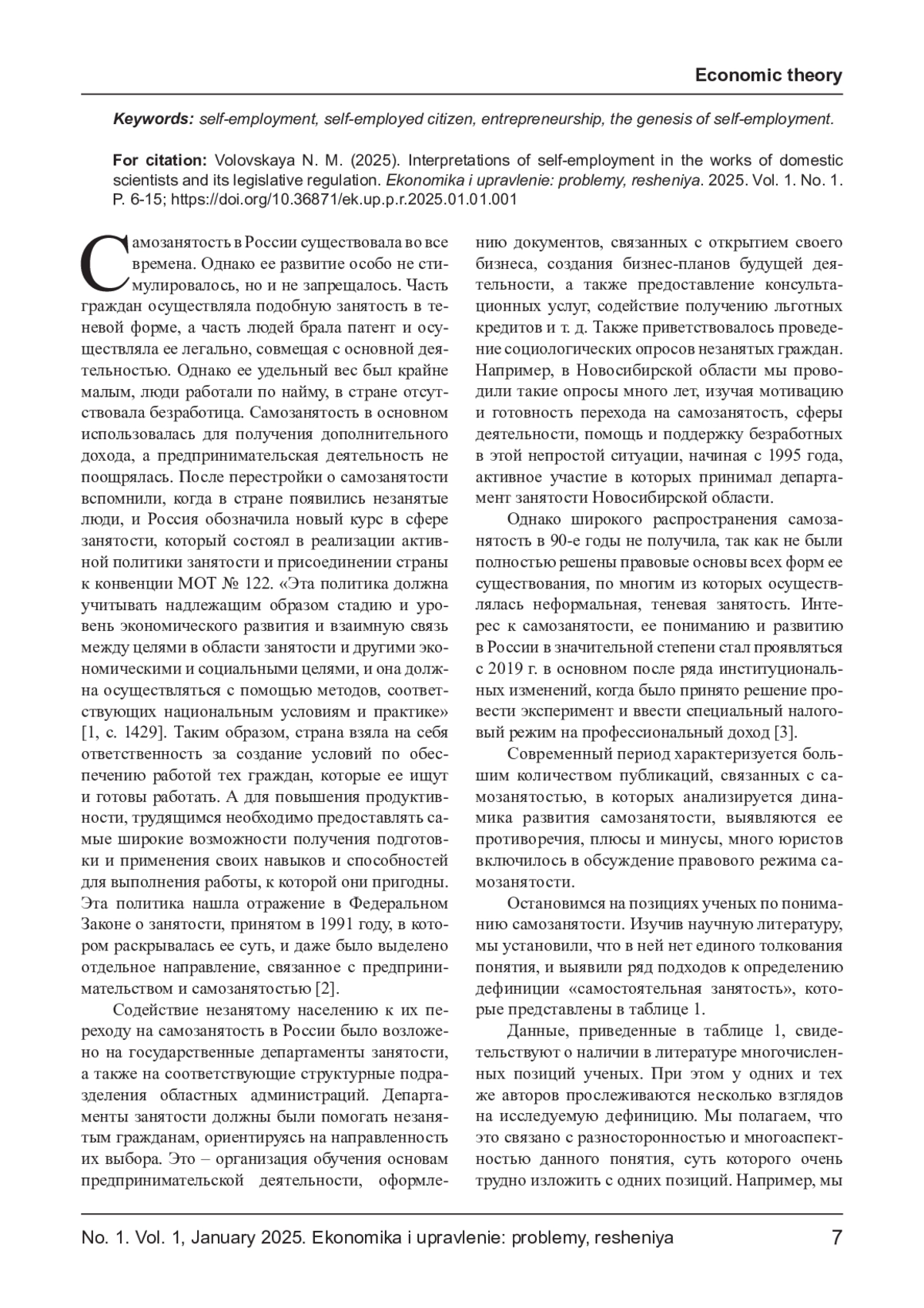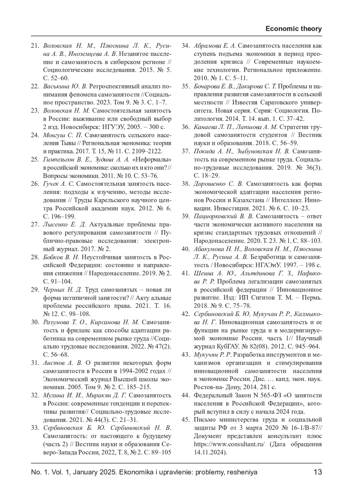ВОЛОВСКАЯ Н. М. ТРАКТОВКИ САМОЗАНЯТОСТИ В ТРУДАХ ОТЕЧЕСТВЕННЫХ УЧЕНЫХ И ЕЕ ЗАКОНОДАТЕЛЬНОЕ РЕГУЛИРОВАНИЕ // ЭКОНОМИКА И УПРАВЛЕНИЕ: ПРОБЛЕМЫ, РЕШЕНИЯ. 2025. ТОМ 1 № 1