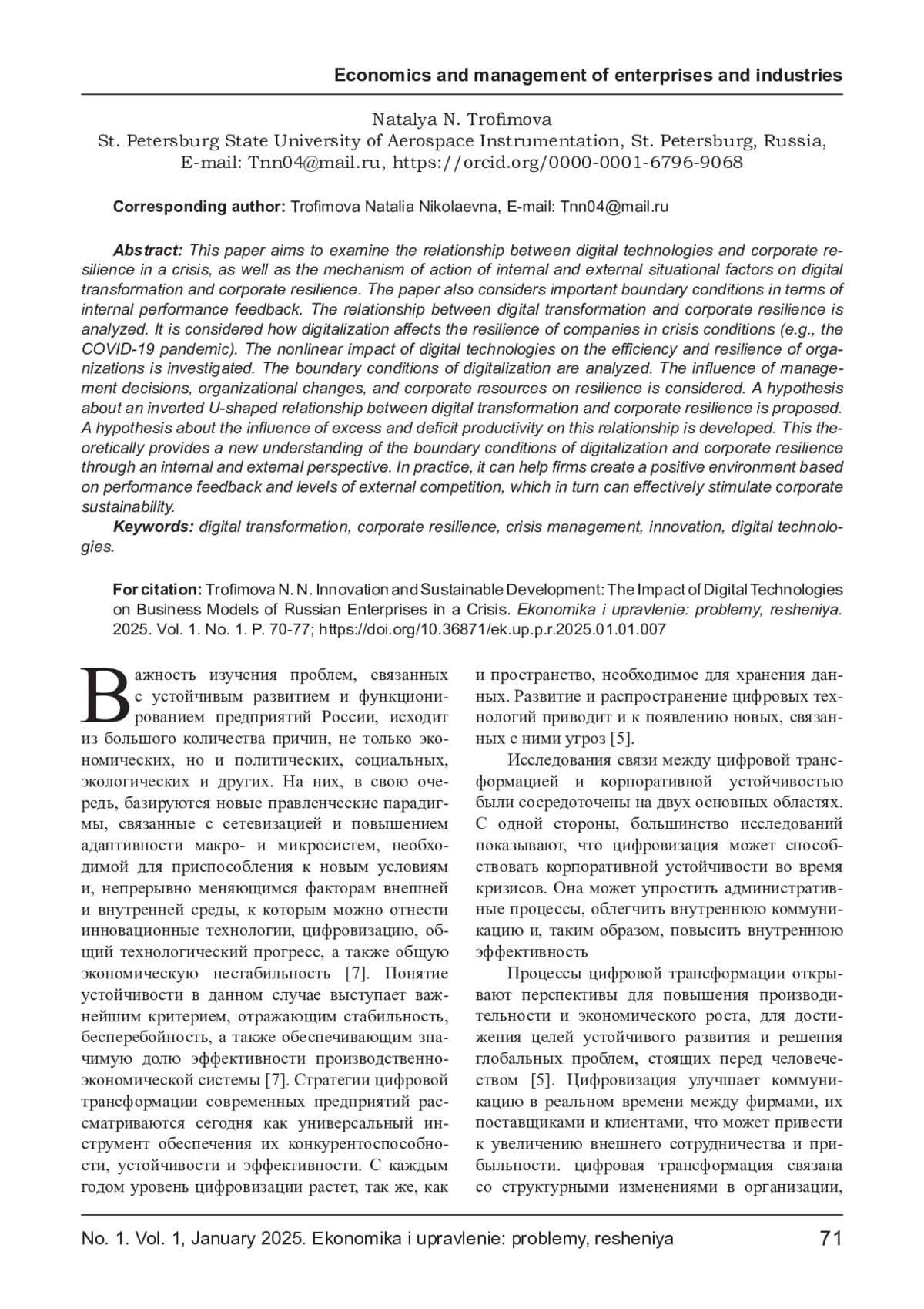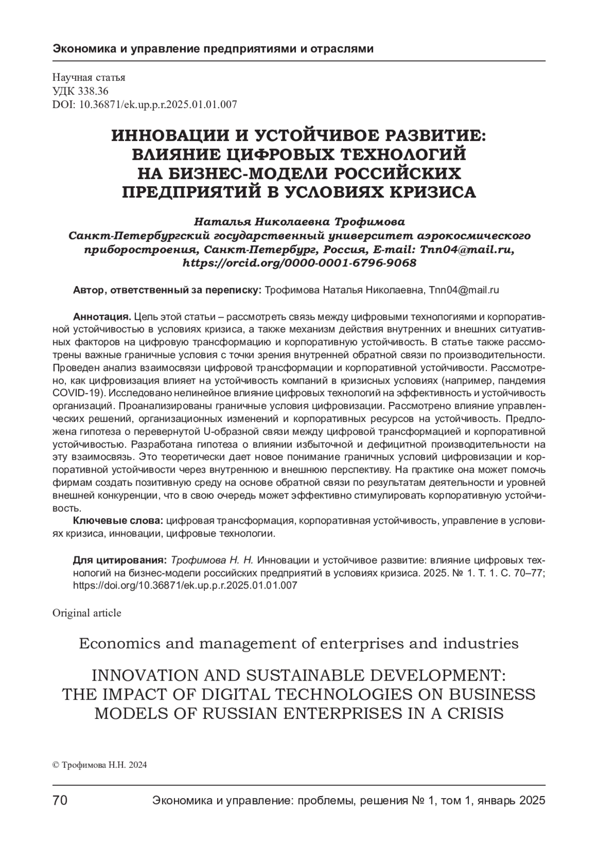 Цель этой статьи - рассмотреть связь между цифровыми технологиями и корпоративной устойчивостью в условиях кризиса, а также механизм действия внутренних и внешних ситуативных факторов на цифровую трансформацию и корпоративную устойчивость. В статье также рассмотрены важные граничные условия с точки зрения внутренней обратной связи по производительности. Проведен анализ взаимосвязи цифровой трансформации и корпоративной устойчивости. Рассмотрено, как цифровизация влияет на устойчивость компаний в кризисных условиях (например, пандемия COVID-19). Исследовано нелинейное влияние цифровых технологий на эффективность и устойчивость организаций. Проанализированы граничные условия цифровизации. Рассмотрено влияние управленческих решений, организационных изменений и корпоративных ресурсов на устойчивость. Предложена гипотеза о перевернутой U-образной связи между цифровой трансформацией и корпоративной устойчивостью. Разработана гипотеза о влиянии избыточной и дефицитной производительности на эту взаимосвязь. Это теоретически дает новое понимание граничных условий цифровизации и корпоративной устойчивости через внутреннюю и внешнюю перспективу. На практике она может помочь фирмам создать позитивную среду на основе обратной связи по результатам деятельности и уровней внешней конкуренции, что в свою очередь может эффективно стимулировать корпоративную устойчивость.