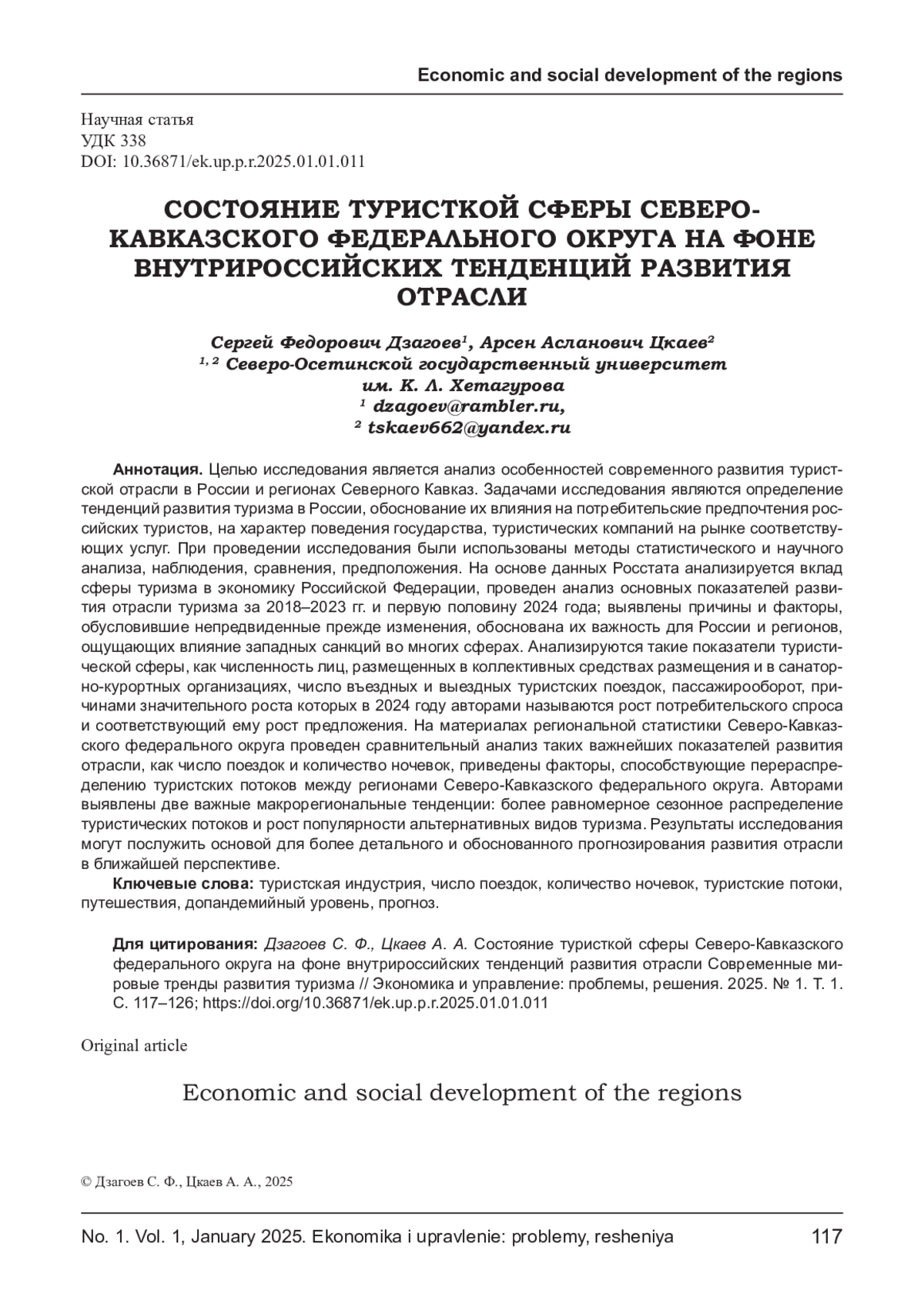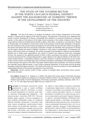 Целью исследования является анализ особенностей современного развития туристской отрасли в России и регионах Северного Кавказ. Задачами исследования являются определение тенденций развития туризма в России, обоснование их влияния на потребительские предпочтения российских туристов, на характер поведения государства, туристических компаний на рынке соответствующих услуг. При проведении исследования были использованы методы статистического и научного анализа, наблюдения, сравнения, предположения. На основе данных Росстата анализируется вклад сферы туризма в экономику Российской Федерации, проведен анализ основных показателей развития отрасли туризма за 2018-2023 гг. и первую половину 2024 года; выявлены причины и факторы, обусловившие непредвиденные прежде изменения, обоснована их важность для России и регионов, ощущающих влияние западных санкций во многих сферах. Анализируются такие показатели туристической сферы, как численность лиц, размещенных в коллективных средствах размещения и в санаторно-курортных организациях, число въездных и выездных туристских поездок, пассажирооборот, причинами значительного роста которых в 2024 году авторами называются рост потребительского спроса и соответствующий ему рост предложения. На материалах региональной статистики Северо-Кавказского федерального округа проведен сравнительный анализ таких важнейших показателей развития отрасли, как число поездок и количество ночевок, приведены факторы, способствующие перераспределению туристских потоков между регионами Северо-Кавказского федерального округа. Авторами выявлены две важные макрорегиональные тенденции: более равномерное сезонное распределение туристических потоков и рост популярности альтернативных видов туризма. Результаты исследования могут послужить основой для более детального и обоснованного прогнозирования развития отрасли в ближайшей перспективе.