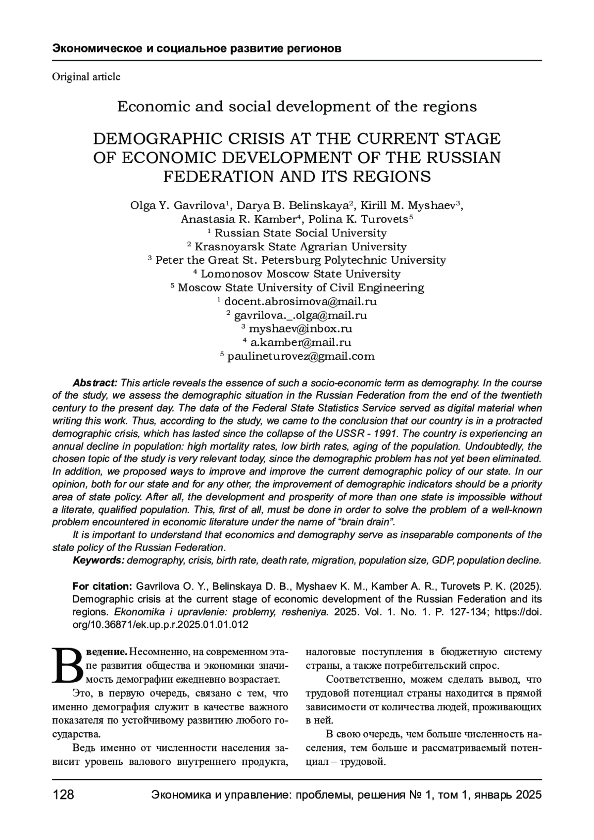В данной статье раскрывается сущность такого социально-экономического термина как демография. В ходе проведенного исследования нами дается оценка демографической ситуации в Российской Федерации в период с конца ХХ века по сегодняшний день. В качестве цифрового материала при написании данной работы послужили данные Федеральной службы государственной статистики. Тем самым, согласно проведенному исследованию, мы пришли к выводу, что наша страна находится в затяжном демографическом кризисе, который длится еще с момента распада СССР - 1991 года. По стране наблюдается ежегодное сокращение численности населения: высокие показатели смертности, низкие - рождаемости, старение населения. Несомненно, выбранная тема исследования является весьма актуальной и на сегодняшний день, поскольку до сих пор демографическая проблема не устранена. Кроме того, нами были предложены пути по усовершенствованию и улучшению действующей демографической политики нашего государства. На наш взгляд, как для нашего государства, так и для любого другого в качестве приоритетных направлений государственной политики должно быть улучшение показателей демографии. Ведь развитие и процветание не одного государства невозможно без наличия грамотного, квалифицированного населения. Это, в первую очередь, необходимо осуществить с целью решения проблемы известной проблемы, встречающейся в экономической литературе под названием «утечки мозгов». Важно понимать, что экономика и демография служат в качестве неразрывных составляющих государственной политики РФ.