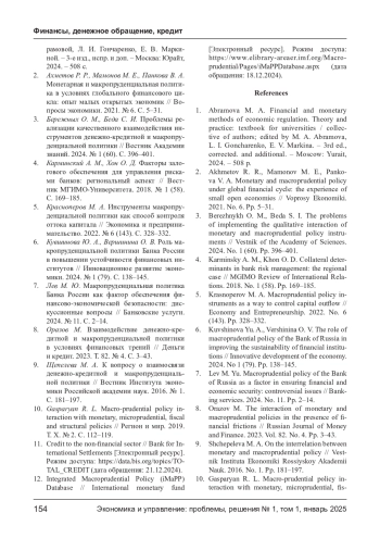 8. Оразов М. Взаимодействие денежно-кредитной и макропруденциальной политики в условиях финансовых трений // Деньги и кредит. 2023. Т. 82. № 4. С. 3-43. EDN: GQUOSI