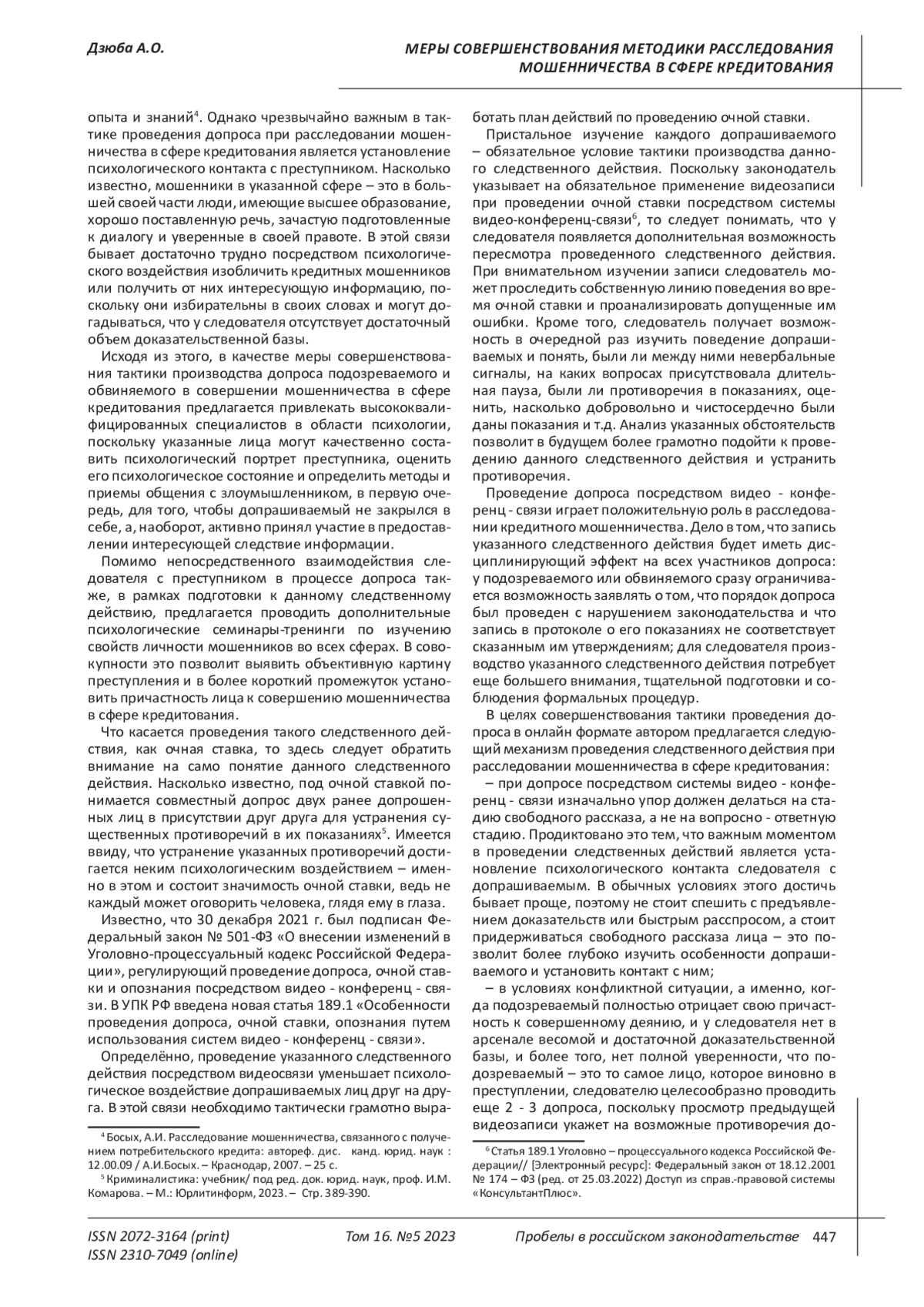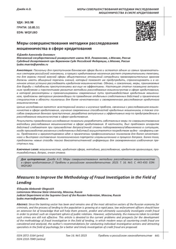ДЗЮБА А. О. МЕРЫ СОВЕРШЕНСТВОВАНИЯ МЕТОДИКИ РАССЛЕДОВАНИЯ МОШЕННИЧЕСТВА В СФЕРЕ КРЕДИТОВАНИЯ // ПРОБЕЛЫ В РОССИЙСКОМ ЗАКОНОДАТЕЛЬСТВЕ. 2023. Т. 16 № 5