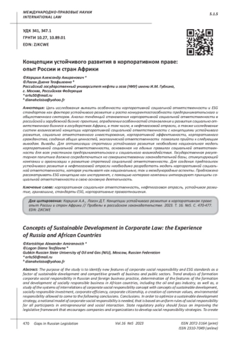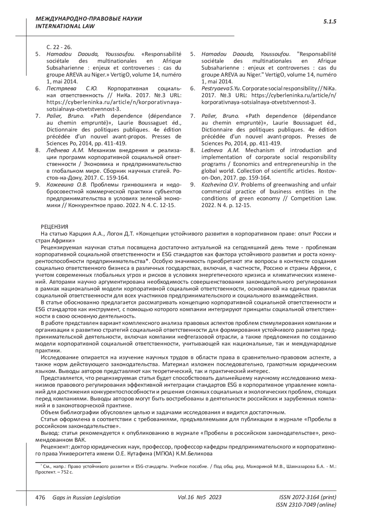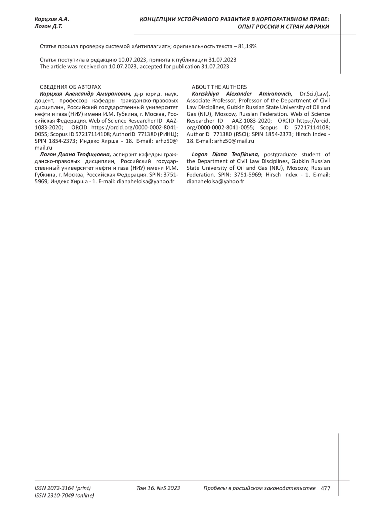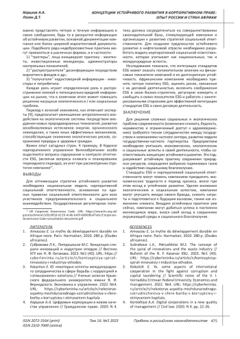 ЛОГОН Д. Т., КАРЦХИЯ А. А. КОНЦЕПЦИИ УСТОЙЧИВОГО РАЗВИТИЯ В КОРПОРАТИВНОМ ПРАВЕ: ОПЫТ РОССИИ И СТРАН АФРИКИ // ПРОБЕЛЫ В РОССИЙСКОМ ЗАКОНОДАТЕЛЬСТВЕ. 2023. Т. 16 № 5