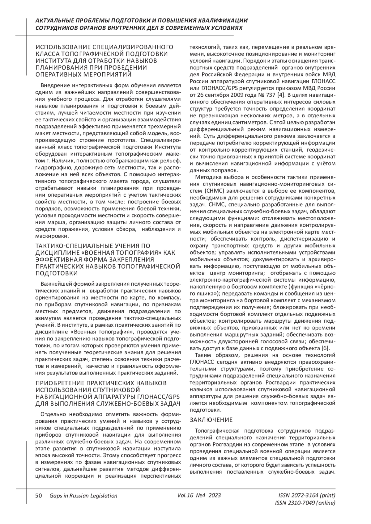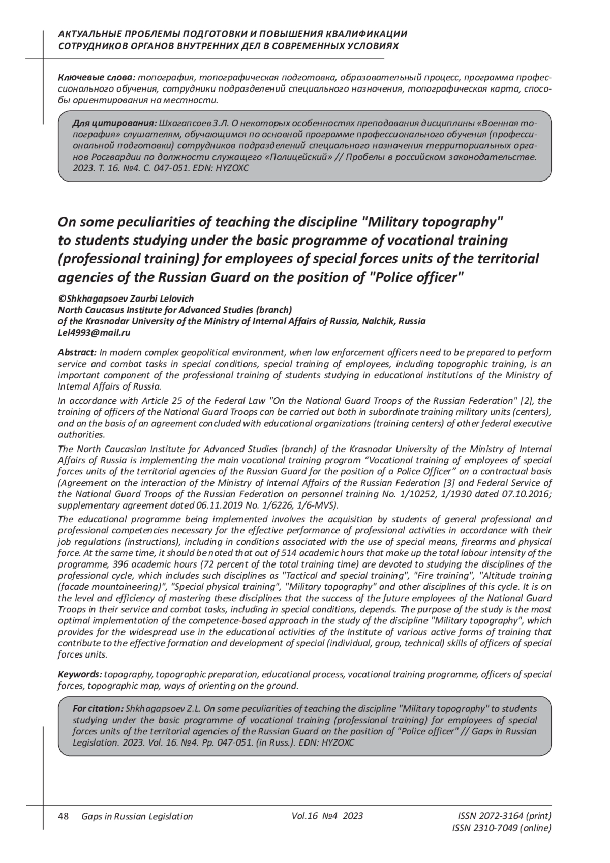 ШХАГАПСОЕВ З. Л. О НЕКОТОРЫХ ОСОБЕННОСТЯХ ПРЕПОДАВАНИЯ ДИСЦИПЛИНЫ "ВОЕННАЯ ТОПОГРАФИЯ" СЛУШАТЕЛЯМ, ОБУЧАЮЩИМСЯ ПО ОСНОВНОЙ ПРОГРАММЕ ПРОФЕССИОНАЛЬНОГО ОБУЧЕНИЯ (ПРОФЕССИОНАЛЬНОЙ ПОДГОТОВКИ) СОТРУДНИКОВ ПОДРАЗДЕЛЕНИЙ СПЕЦИАЛЬНОГО НАЗНАЧЕНИЯ ТЕРРИТОРИАЛЬНЫХ ОРГАНОВ РОСГВАРДИИ ПО ДОЛЖНОСТИ СЛУЖАЩЕГО "ПОЛИЦЕЙСКИЙ" // ПРОБЕЛЫ В РОССИЙСКОМ ЗАКОНОДАТЕЛЬСТВЕ. 2023. Т. 16 № 4