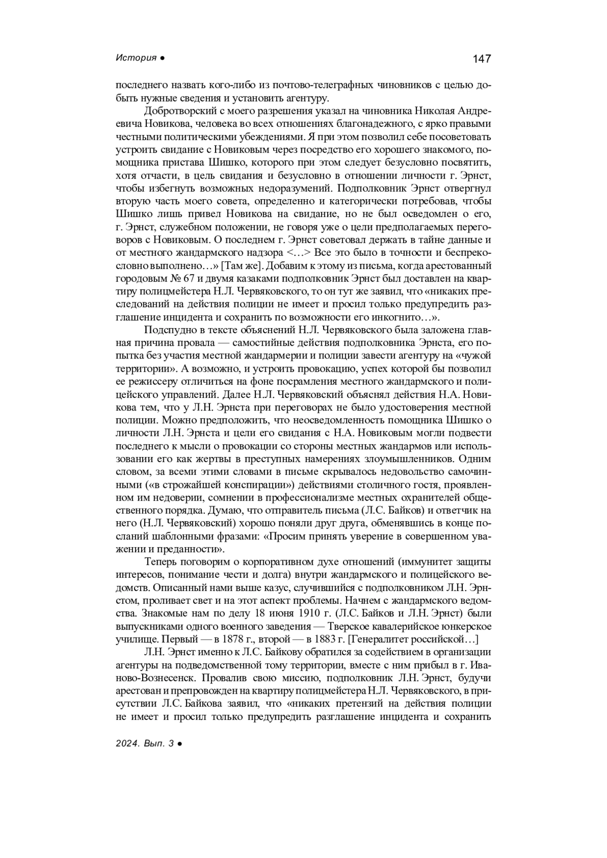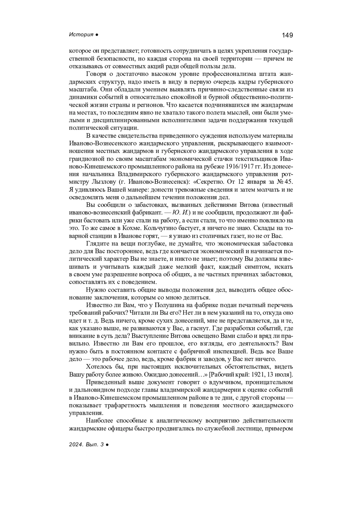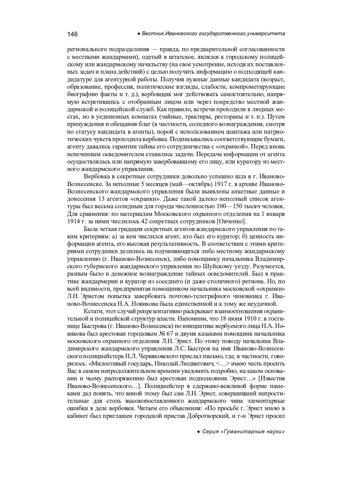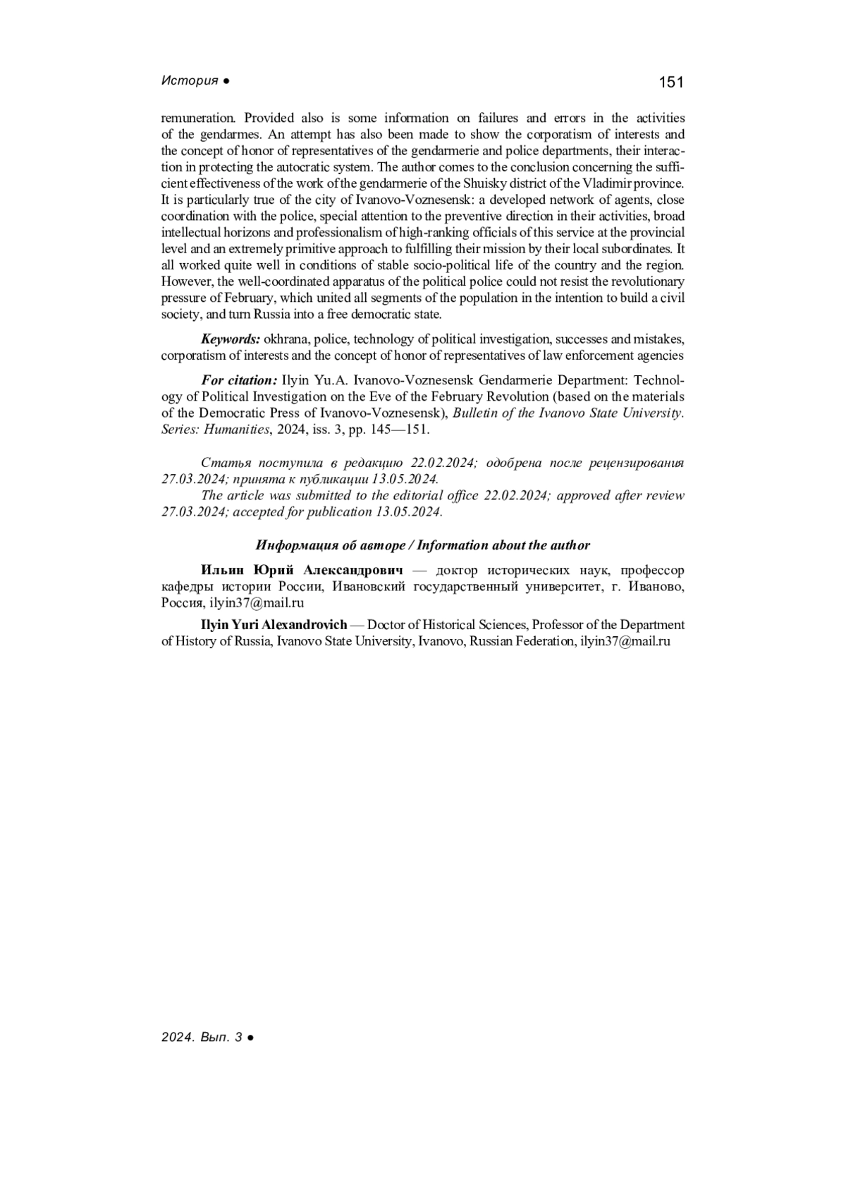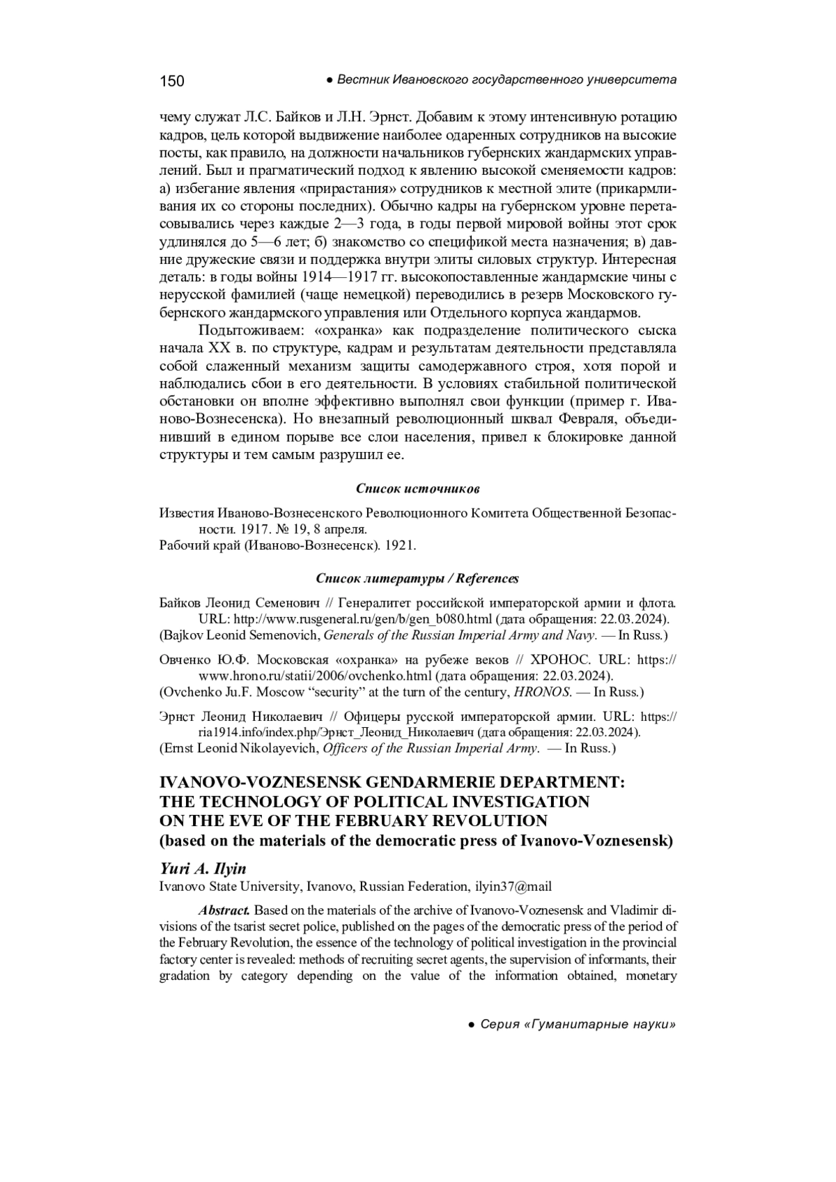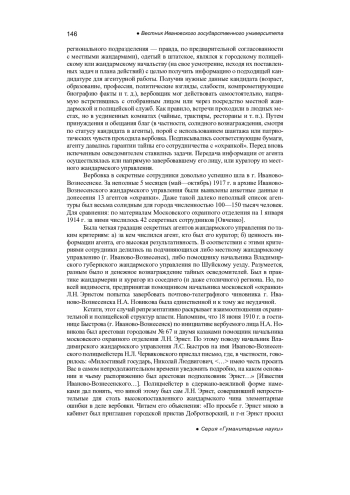 На материалах архива Иваново-Вознесенского и Владимирского подразделений «охранки», опубликованных на страницах демократической печати периода Февральской революции, раскрывается суть технологии работы политического сыска в провинциальном фабричном центре: методы вербовки тайной агентуры, кураторство осведомителей, их градация по категориям в зависимости от ценности добываемой информации, денежное вознаграждение. Приводится фактический материал и о сбоях, ошибках в деятельности жандармов. Предпринята попытка показать корпоративность интересов и понятие чести представителей жандармского и полицейского ведомств, их взаимодействие по охране самодержавного строя. Делается вывод о достаточной эффективности работы жандармерии Шуйского уезда Владимирской губернии и, в частности, г. Иваново-Вознесенска (развитая сеть агентуры, тесная координация с полицией, особое внимание к профилактическому направлению в своей деятельности, широкий интеллектуальный кругозор и профессионализм высокопоставленных чинов данной службы на уровне губернии и крайне примитивный подход к выполнению своей миссии со стороны их подчиненных на местах) в условиях стабильной общественно-политической жизни страны и региона. Но слаженный аппарат политической полиции не устоял перед революционным напором Февраля, объединившим все слои населения в намерении построить гражданское общество, а Россию превратить в свободное демократическое государство