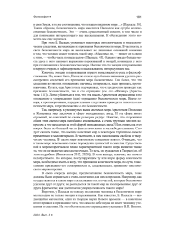 В статье обсуждаются различные аспекты высказывания Б. Паскаля: «Меня ужасает вечное безмолвие этих бесконечных пространств». Особое внимание при этом уделяется рассмотрению трех тесно связанных друг с другом составляющих содержания этого высказывания: научной, философской и теологической. Проведенное в статье обсуждение позволило сделать несколько выводов. Во-первых, было показано, что рассматриваемое высказывание фиксирует эмоции и чувства (подавленности, бессилия, страха) Паскаля в связи с его признанием мира бесконечным. Во-вторых, было подчеркнуто, что обоснование предположения о бесконечности мира является многоплановой и сложной задачей. В частности, было указано, что его специально-научное обоснование, по сути, невозможно. В-третьих, было продемонстрировано, что обсуждаемое высказывание отражает весьма спорное убеждение Паскаля о ничтожестве человека в бесконечном мире. В-четвертых, было обосновано, что указанные негативные эмоции, чувства и убеждения способствовали совершению Паскалем судьбоносного для него мировоззренческого выбора: выбора христианского мировоззрения в достаточно суровой для человека его интерпретации. В-пятых, было высказано и аргументировано предположение, согласно которому признание многообразной бесконечности (неисчерпаемости) мира делает, по сути, беспредметным пари Паскаля