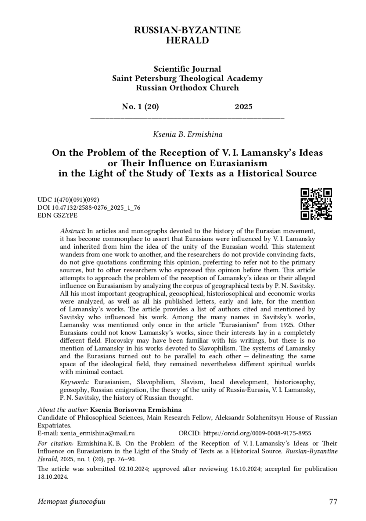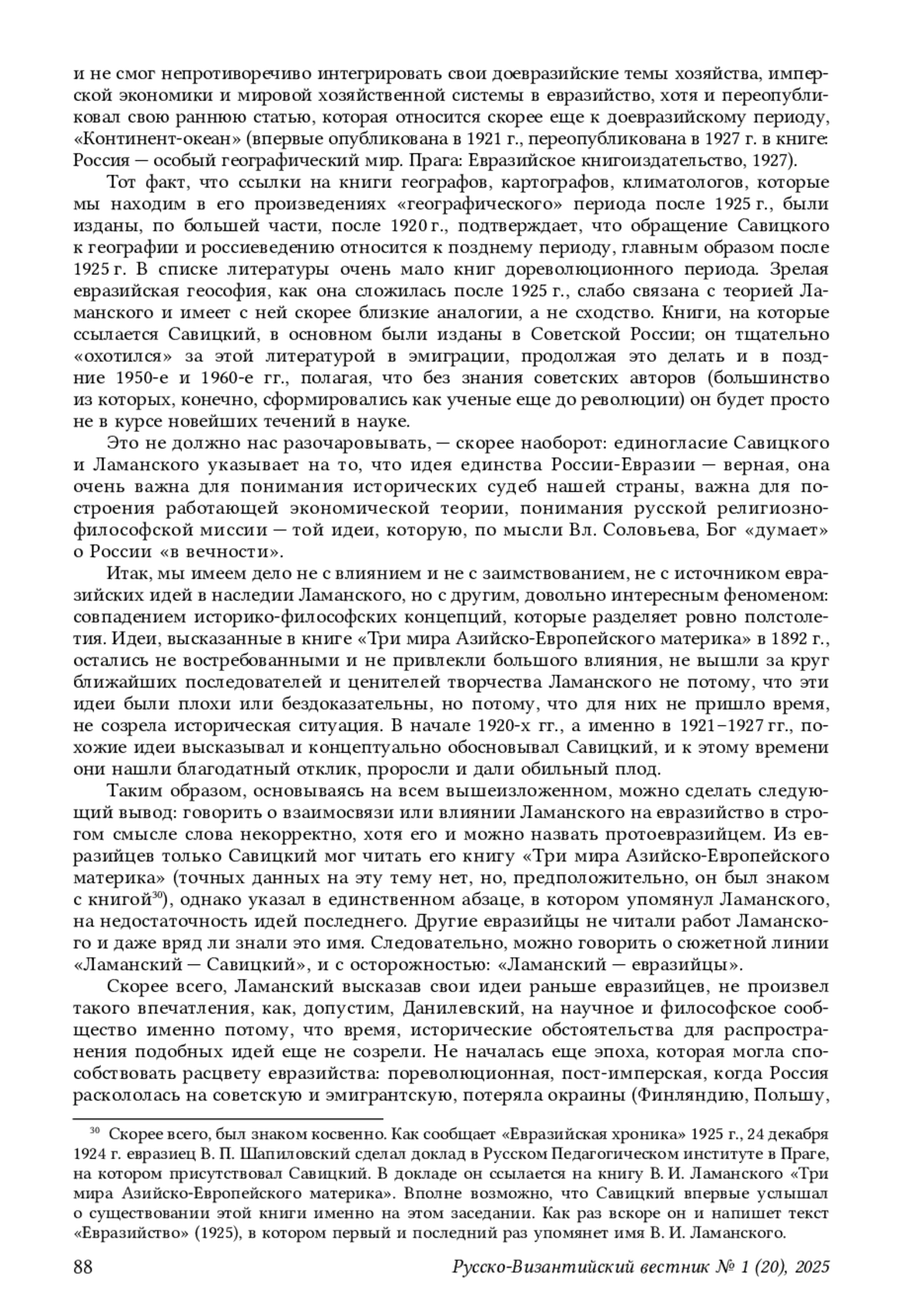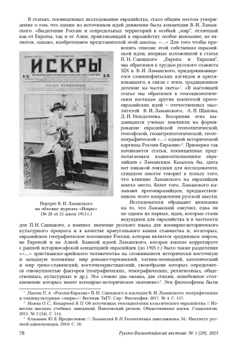 ЕРМИШИНА К. Б. К ПРОБЛЕМЕ РЕЦЕПЦИИ ИДЕЙ В. И. ЛАМАНСКОГО ИЛИ ИХ ВЛИЯНИЯ НА ЕВРАЗИЙСТВО В СВЕТЕ ИЗУЧЕНИЯ ТЕКСТОВ КАК ИСТОРИЧЕСКОГО ИСТОЧНИКА // РУССКО-ВИЗАНТИЙСКИЙ ВЕСТНИК. 2025. № 1 (20)
