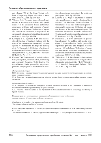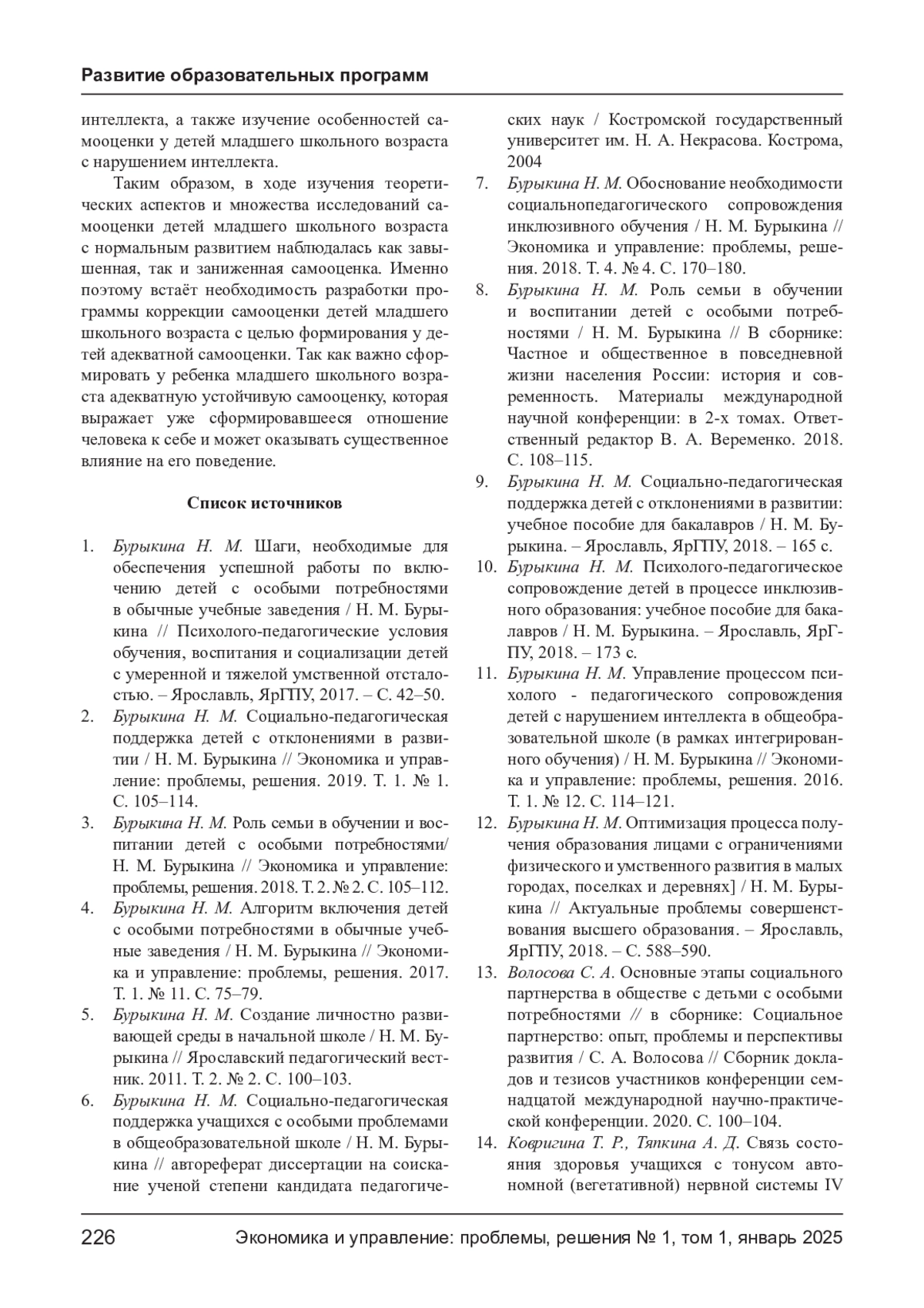 2. Бурыкина Н. М. Социально-педагогическая поддержка детей с отклонениями в развитии / Н. М. Бурыкина // Экономика и управление: проблемы, решения. 2019. Т. 1. № 1. С. 105-114. EDN: YYFWLZ
