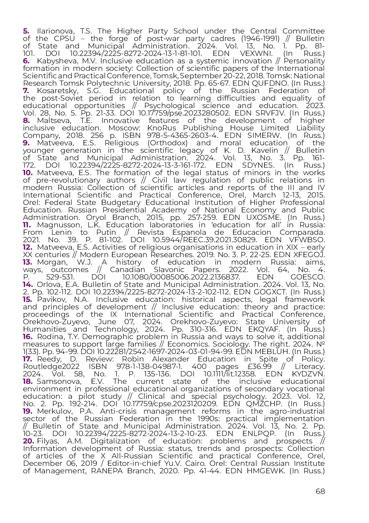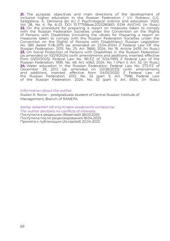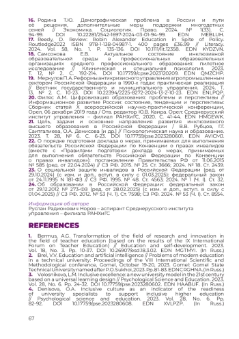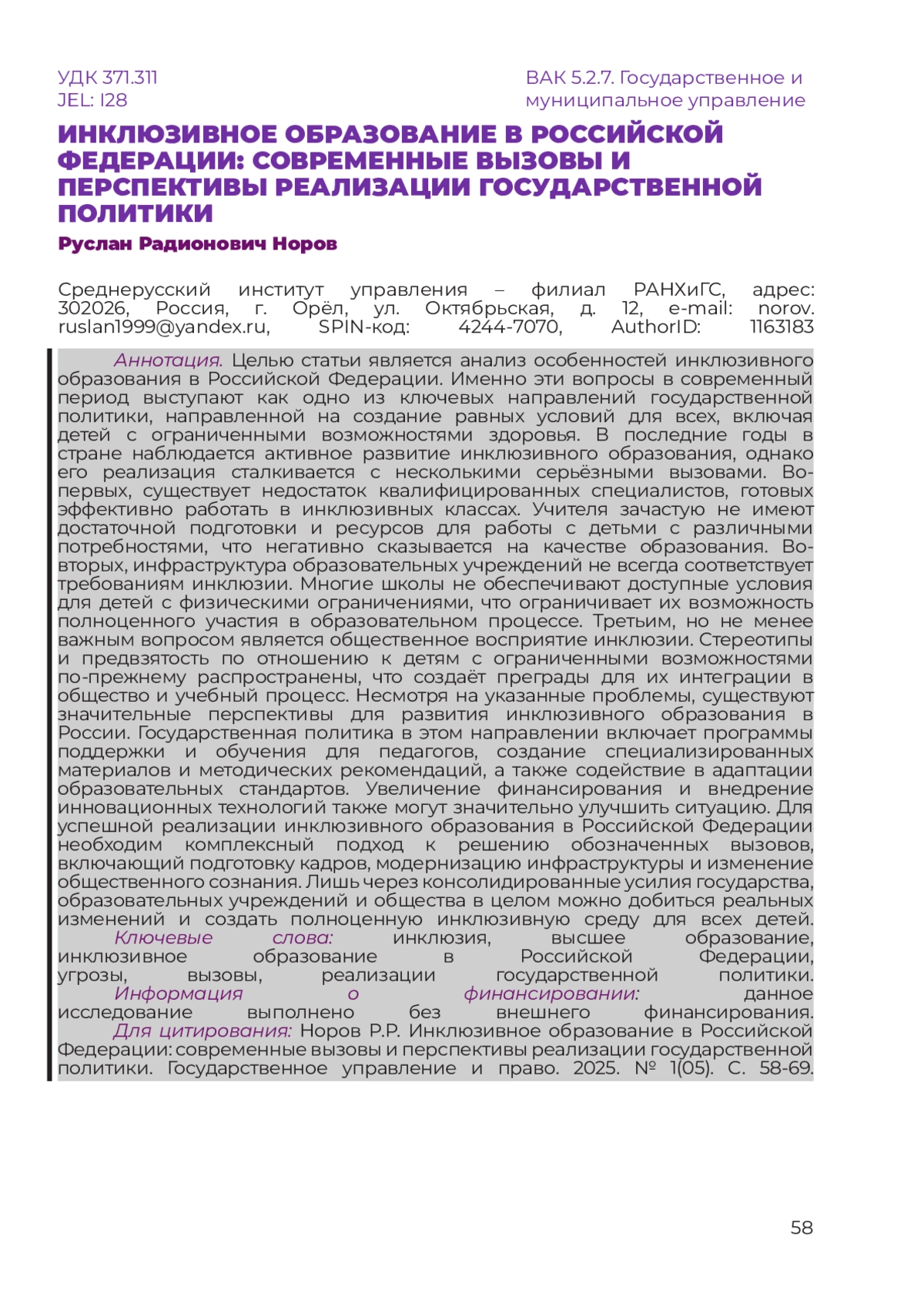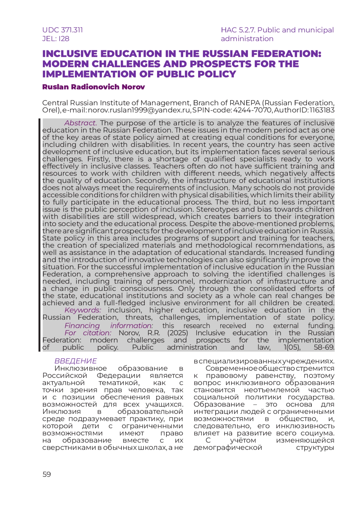 НОРОВ Р. Р. ИНКЛЮЗИВНОЕ ОБРАЗОВАНИЕ В РОССИЙСКОЙ ФЕДЕРАЦИИ: СОВРЕМЕННЫЕ ВЫЗОВЫ И ПЕРСПЕКТИВЫ РЕАЛИЗАЦИИ ГОСУДАРСТВЕННОЙ ПОЛИТИКИ // НАУЧНЫЙ ЖУРНАЛ "ГОСУДАРСТВЕННОЕ УПРАВЛЕНИЕ И ПРАВО". 2025. № 1 (5)