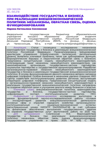 72. Smelyanskaya, M.E., Naumenko, S.N. Sociological examination of intersubjective interaction between the state and business in the implementation of foreign economic policy: regional section // Public administration and law. 2024. № 3(03). Pp. 45-50. (In Russ.).