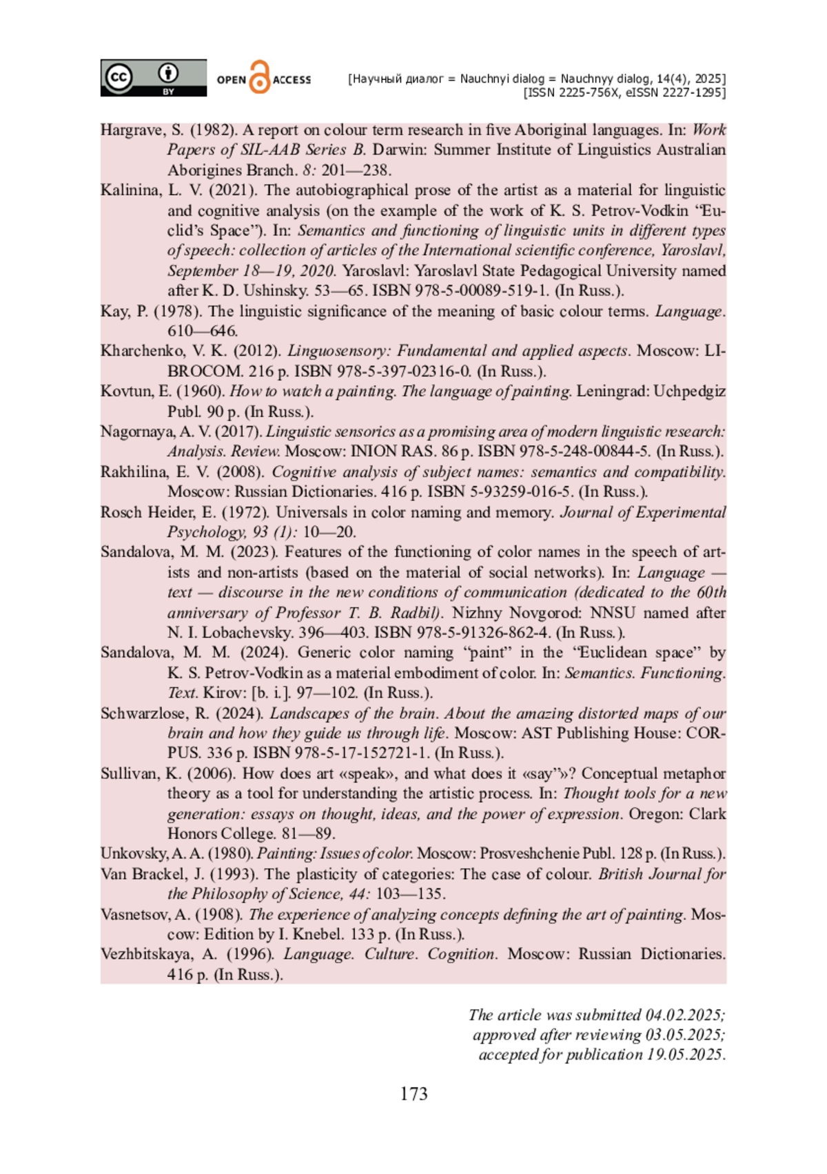 14. Сандалова М. М. Родовое цветонаименование «краска» в «Пространстве Эвклида» К. С. Петрова-Водкина как вещественное воплощение цвета / М. М. Сандалова // Семантика. Функционирование. Текст. - Киров : [б. и.], 2024. - С. 97-102.