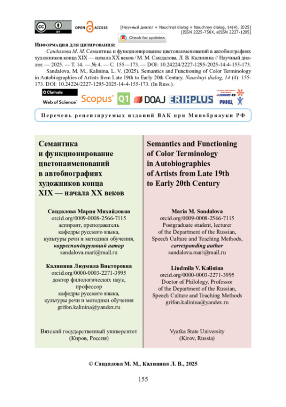13. Сандалова М. М. Особенности функционирования имён цвета в речи художников и не-художников (на материале соцсетей) / М. М. Сандалова // Язык - текст - дискурс в новых условиях коммуникации (к 60-летию профессора Т. Б. Радбиля): сборник статей по материалам Международной научной конференции «Язык - текст - дискурс в новых условиях коммуникации (к 60-летию профессора Т. Б. Радбиля)» (Национальный исследовательский Нижегородский государственный университет им. Н. И. Лобачевского, Институт филологии и журналистики, 22-24 ноября 2023 г.). - Нижний Новгород : ННГУ им. Н. И. Лобачевского, 2023. - С. 396-403. - ISBN 978-5-91326-862-4.