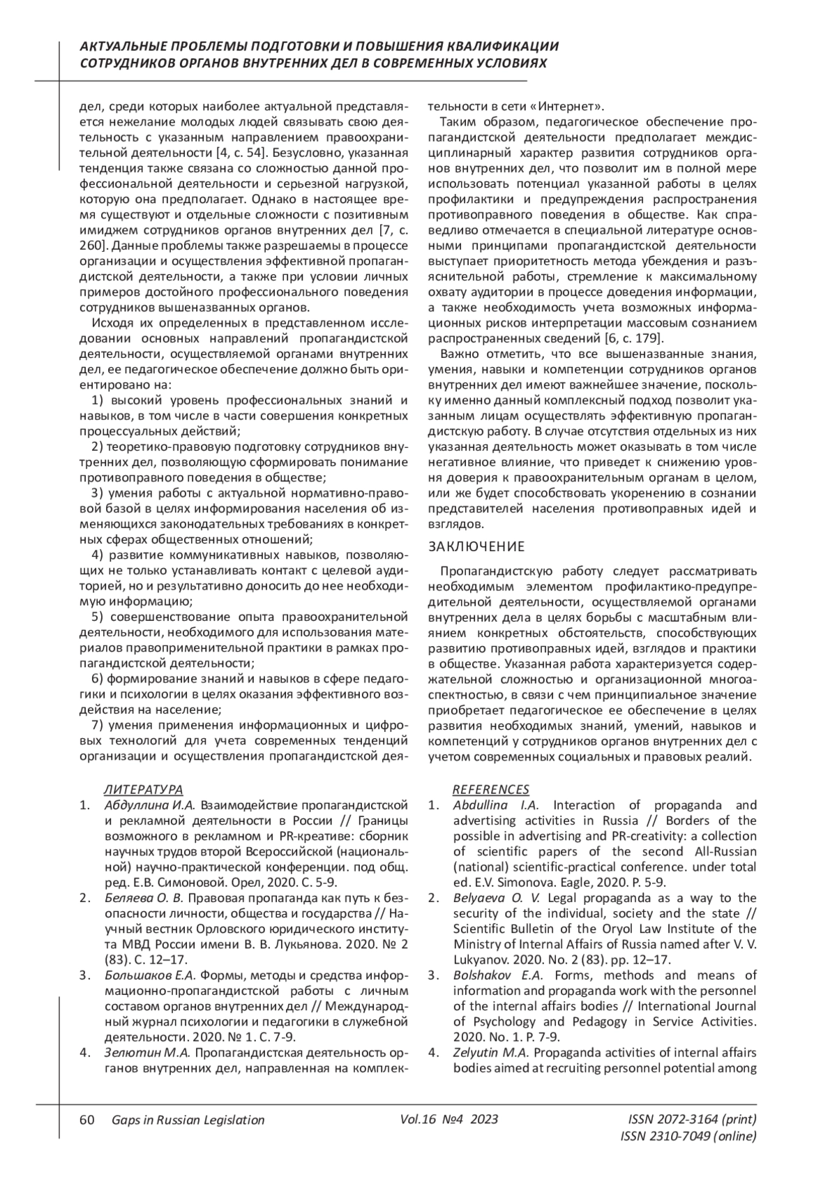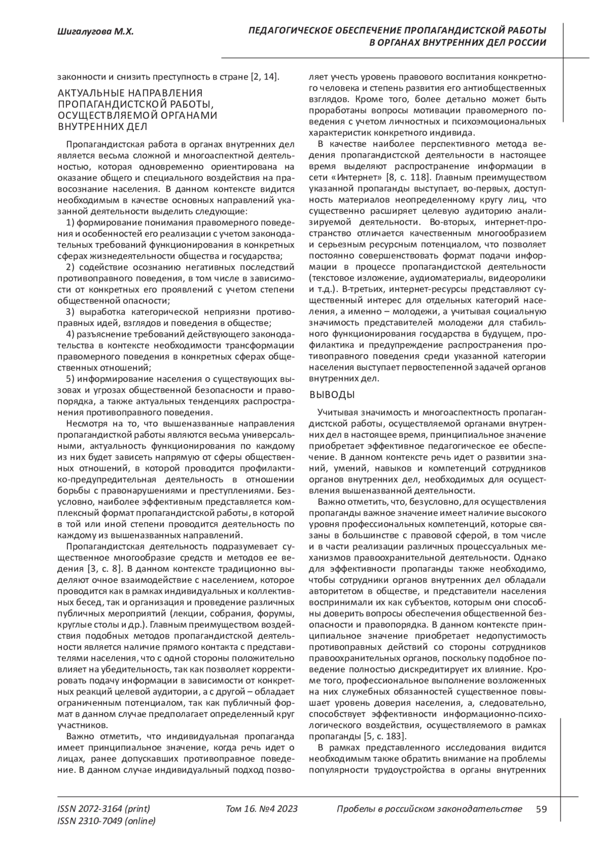 Борьба с распространением противоправного поведения в обществе выступает одним из основных направлений деятельности органов внутренних дел. Указанная деятельность предполагает профилактико-предупредительную работу, основным элементом которой выступает пропаганда. Пропагандистская деятельность ориентирована на распространение определенной информации в целях воздействия на правосознание населения, повышения его уровня и минимизации негативного влияния конкретных противоправных идей и взглядов. В данном контексте особое значение приобретает развитие необходимых знаний, умений, навыков и компетенций сотрудников органов внутренних дел для эффективного осуществления вышеназванной деятельности. Целью представленного исследования выступает анализ особенностей педагогического обеспечения пропагандистской работы в органах внутренних дел России. Автор приходит к выводу о том, что в настоящее время пропагандистская деятельность имеет особое практическое значение для обеспечения общественной безопасности и правопорядка, поскольку сейчас наиболее остро проявляется негативное влияние многих внешних и внутренних обстоятельств на правосознание российского населения, что порождает в том числе и распространение противоправного поведения. Акцентируется внимание на актуальных направлениях пропагандистской работы, осуществляемой органами внутренних дел, и необходимых для их реализации умений, навыков и компетенций сотрудников органов внутренних дел. Отмечается необходимость междисциплинарной подготовки указанных лиц, в том числе формирование знаний и навыков в сфере педагогики, психологии, коммуникативной практики, а также умений применения информационных и цифровых технологий, что позволит им в полной мере использовать потенциал указанной работы в целях профилактики и предупреждения распространения противоправного поведения в обществе.