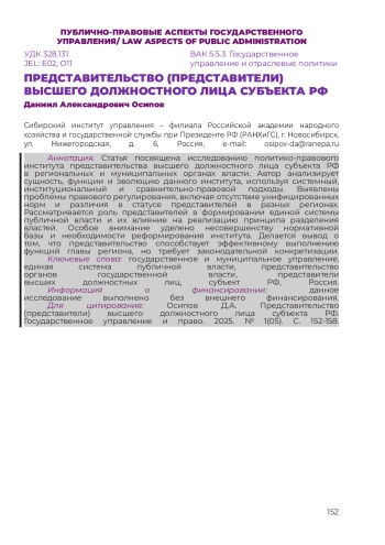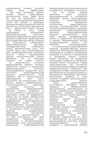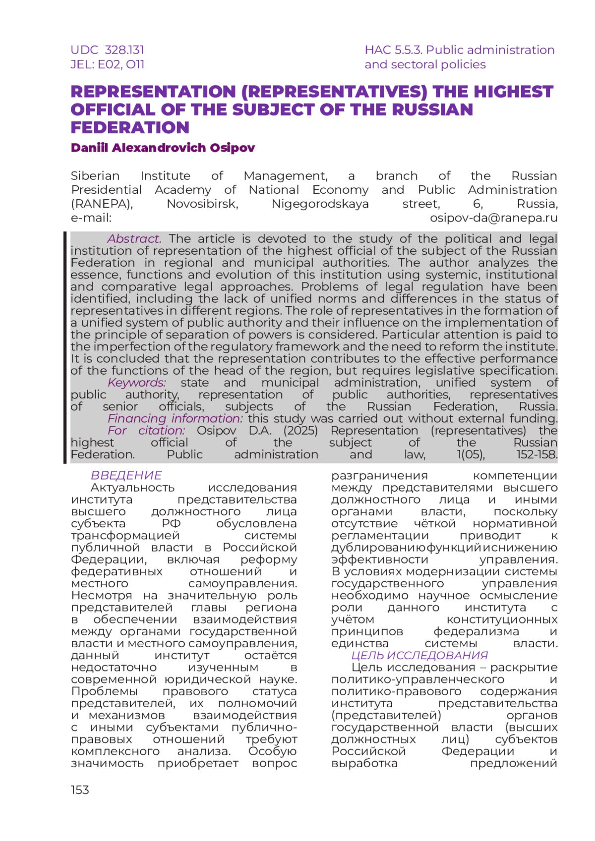 Статья посвящена исследованию политико-правового института представительства высшего должностного лица субъекта РФ в региональных и муниципальных органах власти. Автор анализирует сущность, функции и эволюцию данного института, используя системный, институциональный и сравнительно-правовой подходы. Выявлены проблемы правового регулирования, включая отсутствие унифицированных норм и различия в статусе представителей в разных регионах. Рассматривается роль представителей в формировании единой системы публичной власти и их влияние на реализацию принципа разделения властей. Особое внимание уделено несовершенству нормативной базы и необходимости реформирования института. Делается вывод о том, что представительство способствует эффективному выполнению функций главы региона, но требует законодательной конкретизации.