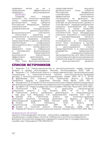 2. Авакьян С.А. Публичная власть и представительство: организационные, социальные и персоналистские начала (конституционно-правовой взгляд) // Конституционное и муниципальное право. 2014. № 11. С. 20-30.