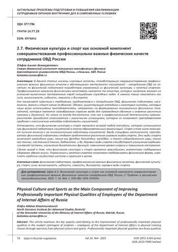 В данной статье изучены ключевые аспекты, способствующие совершенствованию профессионально важных физических качеств у обучающегося контингента слушателей - сотрудников ОВД на занятиях по физической подготовке посредством упражнений из физической культуры и занятий спортом. Профессионально важными физическими качествами являются те качества, которые напрямую влияют на успешное выполнение поставленных перед полицейским служебных задач. А именно такие показатели как сила, выносливость, гибкость, ловкость и быстрота. Как показывает практика и требования, предъявляемые к сотрудникам ОВД, физическая подготовка, несомненно, важна и стоит неким особняком. Однако, существующая методика и некоторые системы, которые чаще всего используемые преподавателями, направлены на формировании минимальных физических показателей, которые являются своеобразным порогом входа для прохождения обучения и освоения различных приемов и движений. Но этого не всегда достаточно, так как в профессиональной деятельности правоохранителям приходится сталкиваться с различными ситуациями, которые не позволяют преподавателям прибегая к классическим методам подготовить слушателей. Установлено, что физическая культура и спорт являются основой любой методики, которая используется при физической подготовке слушателей в стенах образовательных организаций. Спорт в том числе оказывает сильное влияние и на психологическую подготовку слушателей. Ввиду специфики контингента, преподаватели физической подготовки отдают предпочтение различным игровым видам спорта. Эти виды спорта включают командные игры, такие как футбол, баскетбол, волейбол, а также индивидуальные игры, такие как теннис, настольный теннис, бадминтон, и др. Игровые виды спорта способствуют улучшению кардиоваскулярной системы, улучшению дыхательных функций, повышению уровня энергии и повышению настроения. Сделан вывод о том, что физическая культура и спорт являются важнейшими элементами поддержания здорового образа жизни. Упражнения и занятия спортом позволяют поддерживать физическую форму, укреплять сердечно-сосудистую систему и организм в целом.