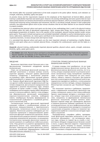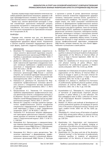 10. Ярославский М.А., Тхагалегов А.А. Профессионально-значимые физические качества сотрудников полиции: пути формирования и совершенствования // В сборнике: Инновации в науке и практике. Сборник трудов по материалам VI Всероссийского конкурса научно-исследовательских работ. Уфа, 2021. С. 40-45. EDN: EUXLHX