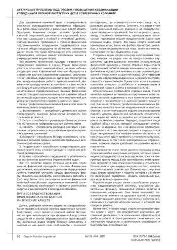 В данной статье изучены физические качества, которые слушатели образовательных организаций МВД России развивают в целях поддержания высокого уровня работоспособности и здоровья. Известно, что главным аспектом в формировании и развитии физических качеств слушателей образовательных организаций МВД является здоровый образ жизни. Это включает в себя правильное питание, регулярные физические нагрузки, достаточный отдых и сон. Образовательные организации МВД могут проводить соответствующую работу по пропаганде здорового образа жизни среди своих слушателей. Специалисты физической культуры и спорта отмечают, что основными физическими качествами, которые формируются и развиваются у слушателей образовательных организаций МВД России, являются: сила - способность противостоять сопротивлению и перемещать тяжелые предметы, используя мышечное напряжение; выносливость - способность сохранять физическую активность в течение продолжительного времени, справляться с усталостью и восстановиться после нагрузки; ловкость - способность быстро и гибко двигаться, изменять направление движения, управлять своим телом; быстрота - способность быстро реагировать на ситуации, двигаться быстро и точно; гибкость - способность сгибаться и растягиваться, поддерживать нормальный уровень подвижности и гарантировать безопасность при выполнении операций. Для развития указанных качеств, необходимы определённые упражнения. Существует ряд методик и упражнений, которые позволяют лучше проработать определенные группы мышц или отдельные показатели. Однако, также необходимы различные методики и различные виды спорта для развития разных показателей физической силы. Невозможно будет прибегая только к одной методике или виду спорта развить все качества до определённого уровня. Так или иначе один из показатели будет проседать, и чтобы нивелировать эти показатели необходимо использовать определенные методики и упражнения из различных видов спорта.