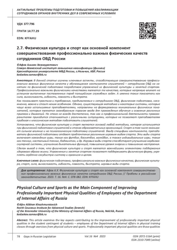 Krymshokalov A.Z., Tkhazeplov R.L. Actual problems of formation of professionally important physical qualities in police officers // In the collection: The best pedagogical work of 2021. Collection of articles of the International Research Competition. Penza, 2021. pp. 124-127.
