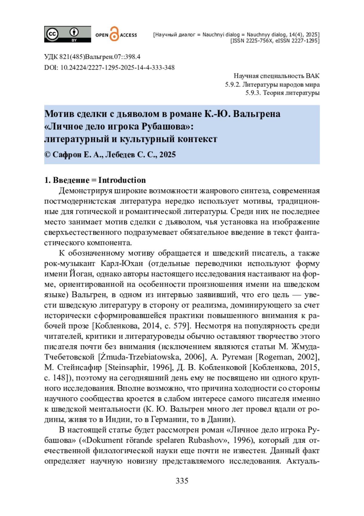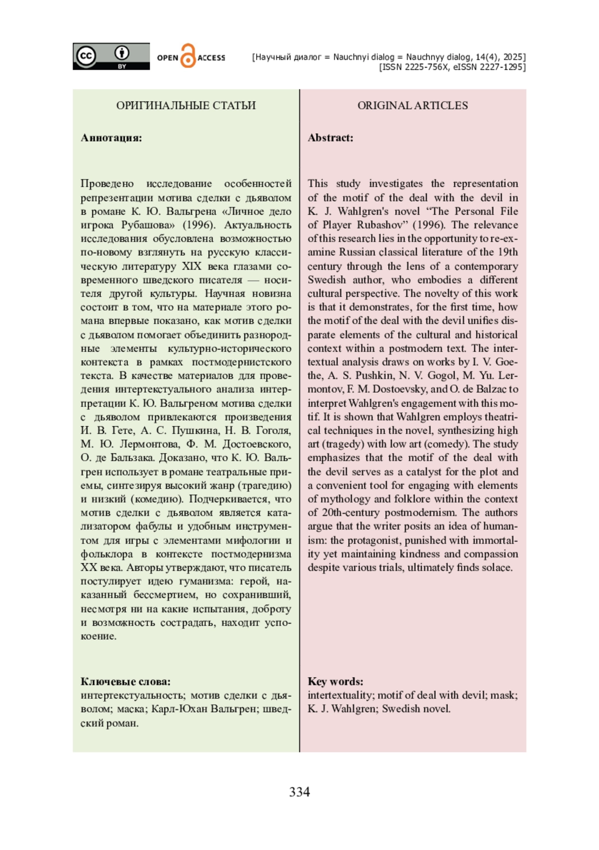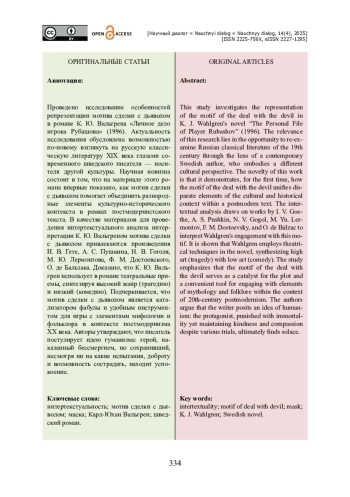 Проведено исследование особенностей репрезентации мотива сделки с дьяволом в романе К. Ю. Вальгрена «Личное дело игрока Рубашова» (1996). Актуальность исследования обусловлена возможностью по-новому взглянуть на русскую классическую литературу XIX века глазами современного шведского писателя — носителя другой культуры. Научная новизна состоит в том, что на материале этого романа впервые показано, как мотив сделки с дьяволом помогает объединить разнородные элементы культурно-исторического контекста в рамках постмодернистского текста. В качестве материалов для проведения интертекстуального анализа интерпретации К. Ю. Вальгреном мотива сделки с дьяволом привлекаются произведения И. В. Гете, А. С. Пушкина, Н. В. Гоголя, М. Ю. Лермонтова, Ф. М. Достоевского, О. де Бальзака. Доказано, что К. Ю. Вальгрен использует в романе театральные приемы, синтезируя высокий жанр (трагедию) и низкий (комедию). Подчеркивается, что мотив сделки с дьяволом является катализатором фабулы и удобным инструментом для игры с элементами мифологии и фольклора в контексте постмодернизма XX века. Авторы утверждают, что писатель постулирует идею гуманизма: герой, наказанный бессмертием, но сохранивший, несмотря ни на какие испытания, доброту и возможность сострадать, находит успокоение.