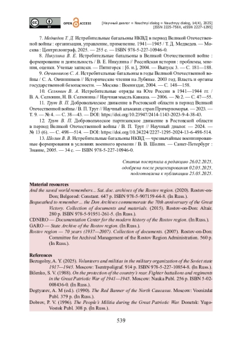 Исследуется вопрос организации и деятельности истребительных отрядов в Ростовской области в период Великой Отечественной войны: нормативная база их создания, специфика формирования и комплектования, уровень обеспечения вооружением и снаряжением, материально-техническое и финансовое снабжение. Вводится в научный оборот ряд архивных документов. Источниковой базой выступили как опубликованные в региональных сборниках документов, так и архивные материалы. Подчеркиваются различия между ополченческими частями и иными добровольческими структурами: у них была разная подчиненность. Сообщается, что сразу после начала войны в соответствии с решениями Советского правительства партийно-советское руководство Ростовской области быстро развернуло масштабную работу по формированию истребительных батальонов во всех городах и районах области. Показано, что в крайне сжатые сроки удалось создать довольно значительное количество данных отрядов, обеспечить их необходимыми кадрами рядового и командного состава, вооружением и снаряжением. Подчеркивается важная роль истребительных отрядов области в поддержании правопорядка, охране важных объектов промышленной и транспортной инфраструктуры в прифронтовой зоне и в оборонительных боях осени 1941 и лета 1942 годов на территории Ростовской области. Отмечается, что личный состав отрядов не был подготовлен к ведению боевых действий непосредственно на линии фронта, однако оказал неоценимую помощь в начальный период войны.