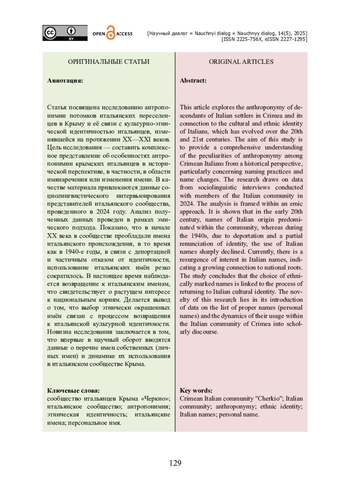 Статья посвящена исследованию антропонимии потомков итальянских переселенцев в Крыму и её связи с культурно-этнической идентичностью итальянцев, изменявшейся на протяжении XX—XXI веков. Цель исследования — составить комплексное представление об особенностях антропонимии крымских итальянцев в исторической перспективе, в частности, в области имянаречения или изменения имени. В качестве материала привлекаются данные социолингвистического интервьюирования представителей итальянского сообщества, проведенного в 2024 году. Анализ полученных данных проведен в рамках эмического подхода. Показано, что в начале ХХ века в сообществе преобладали имена итальянского происхождения, в то время как в 1940-е годы, в связи с депортацией и частичным отказом от идентичности, использование итальянских имён резко сократилось. В настоящее время наблюдается возвращение к итальянским именам, что свидетельствует о растущем интересе к национальным корням. Делается вывод о том, что выбор этнически окрашенных имён связан с процессом возвращения к итальянской культурной идентичности. Новизна исследования заключается в том, что впервые в научный оборот вводятся данные о перечне имен собственных (личных имен) и динамике их использования в итальянском сообществе Крыма.