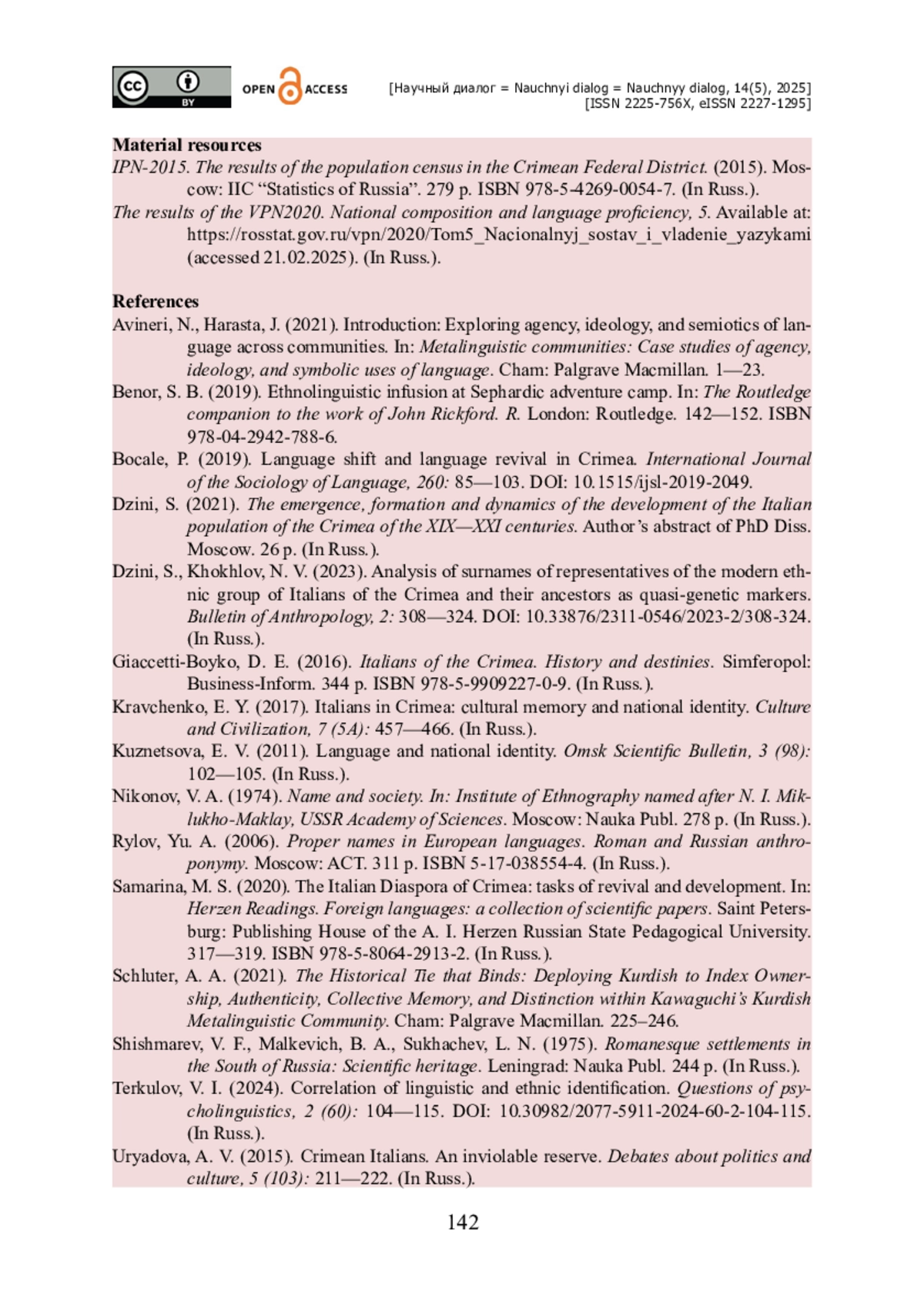 15. Bocale P. Language shift and language revival in Crimea / P. Bocale // International Journal of the Sociology of Language. - 2019. - № 260. - Pp. 85-103. - https://doi.org/10.1515/ ijsl-2019-2049.