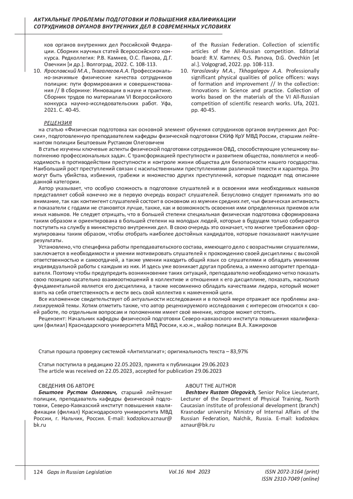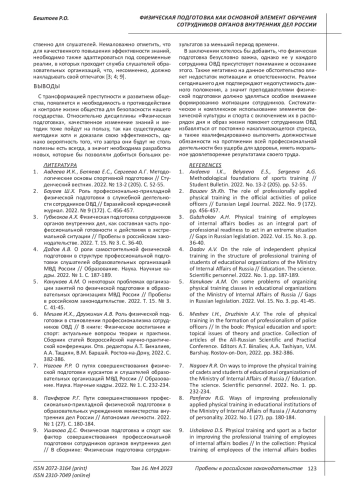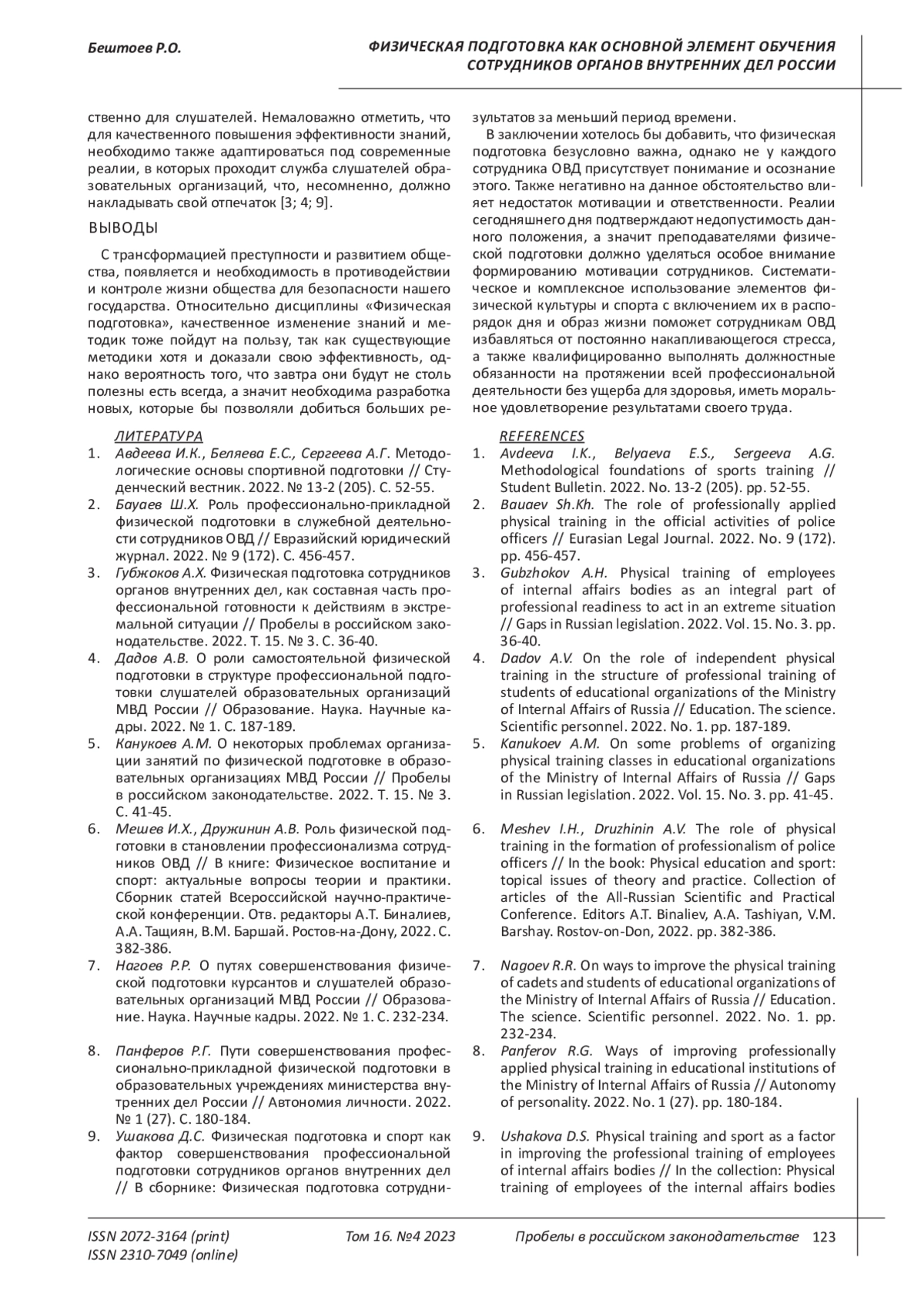 БЕШТОЕВ Р. О. ФИЗИЧЕСКАЯ ПОДГОТОВКА КАК ОСНОВНОЙ ЭЛЕМЕНТ ОБУЧЕНИЯ СОТРУДНИКОВ ОРГАНОВ ВНУТРЕННИХ ДЕЛ РОССИИ // ПРОБЕЛЫ В РОССИЙСКОМ ЗАКОНОДАТЕЛЬСТВЕ. 2023. Т. 16 № 4
