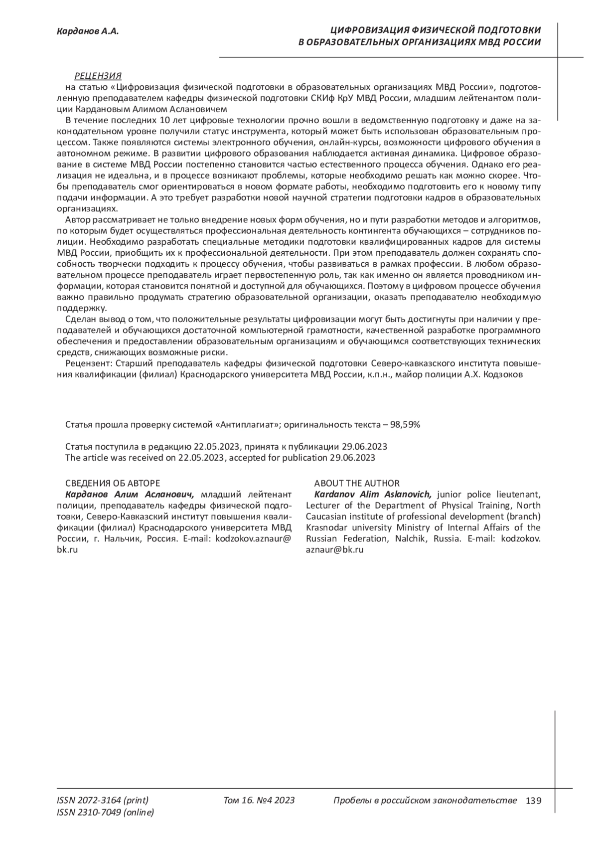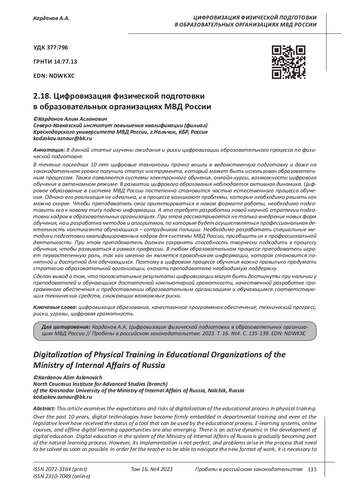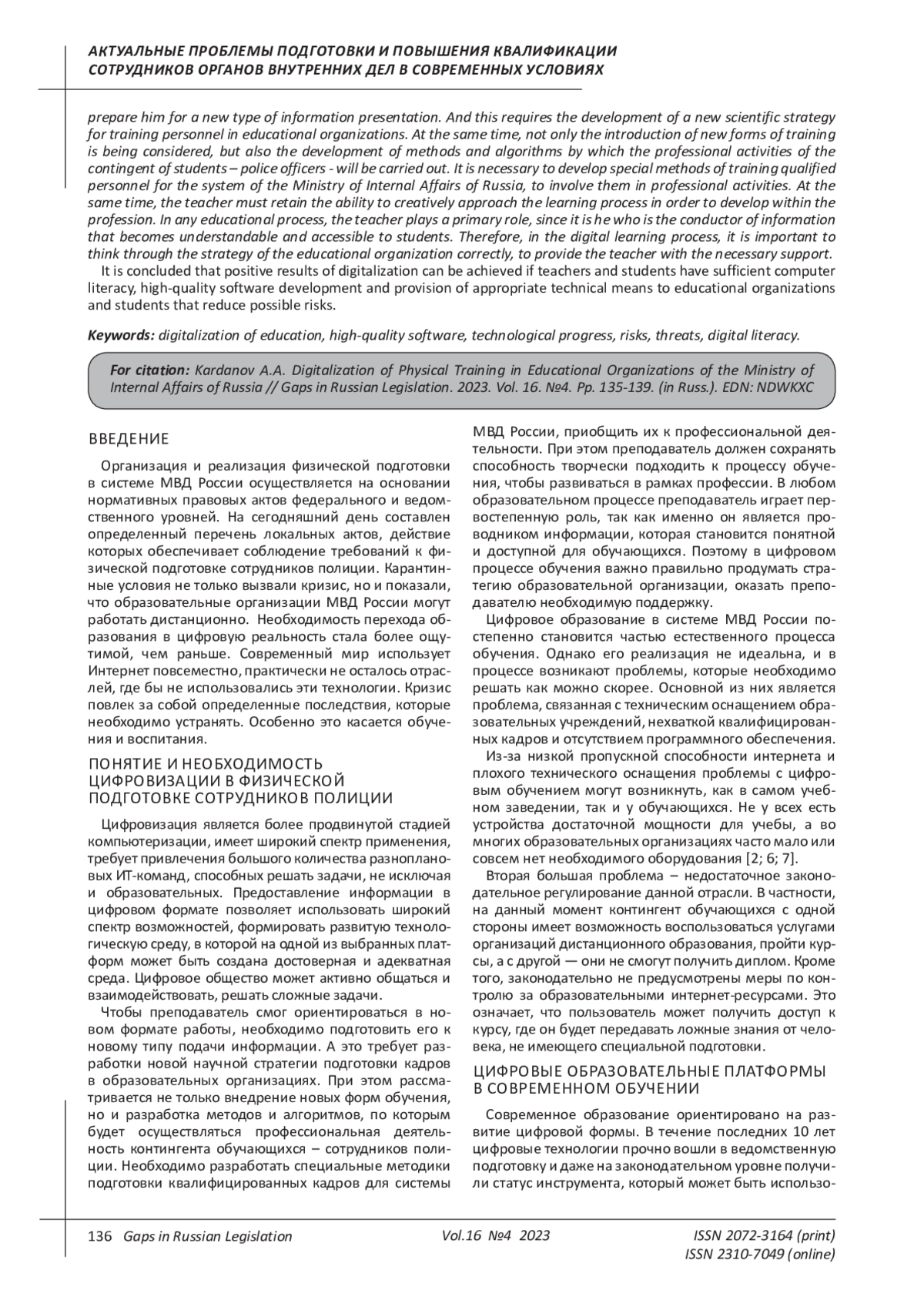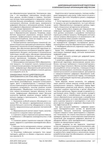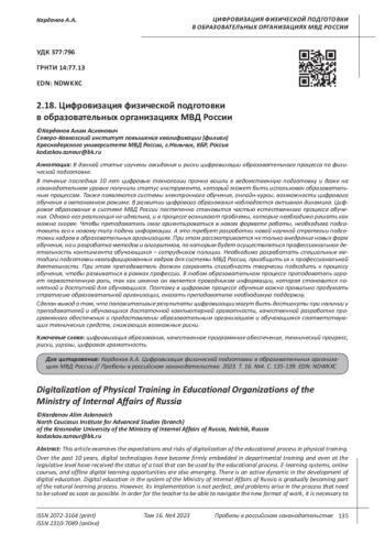 КАРДАНОВ А. А. ЦИФРОВИЗАЦИЯ ФИЗИЧЕСКОЙ ПОДГОТОВКИ В ОБРАЗОВАТЕЛЬНЫХ ОРГАНИЗАЦИЯХ МВД РОССИИ // ПРОБЕЛЫ В РОССИЙСКОМ ЗАКОНОДАТЕЛЬСТВЕ. 2023. Т. 16 № 4