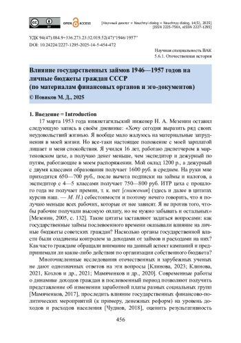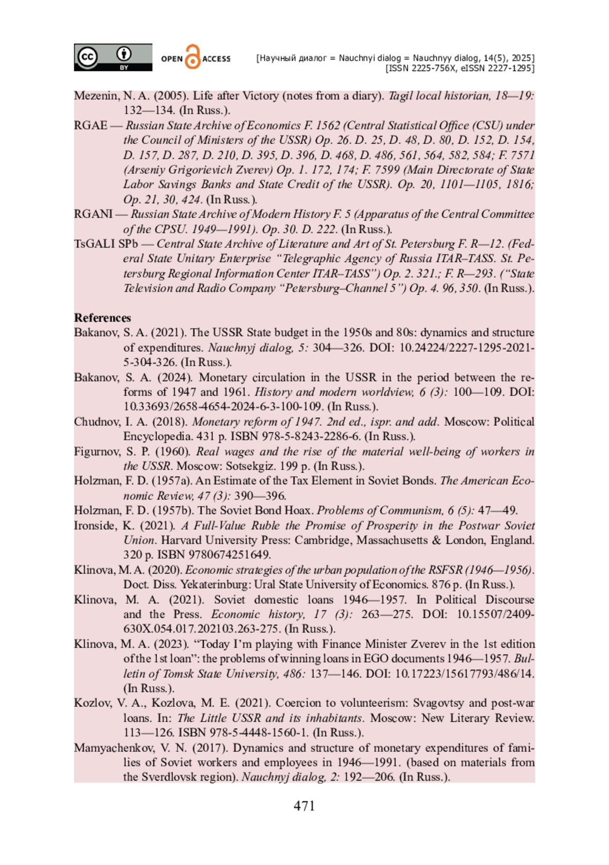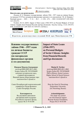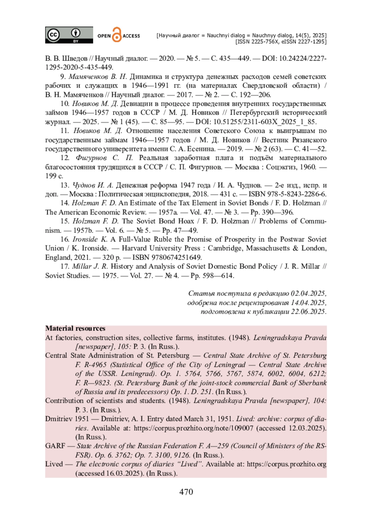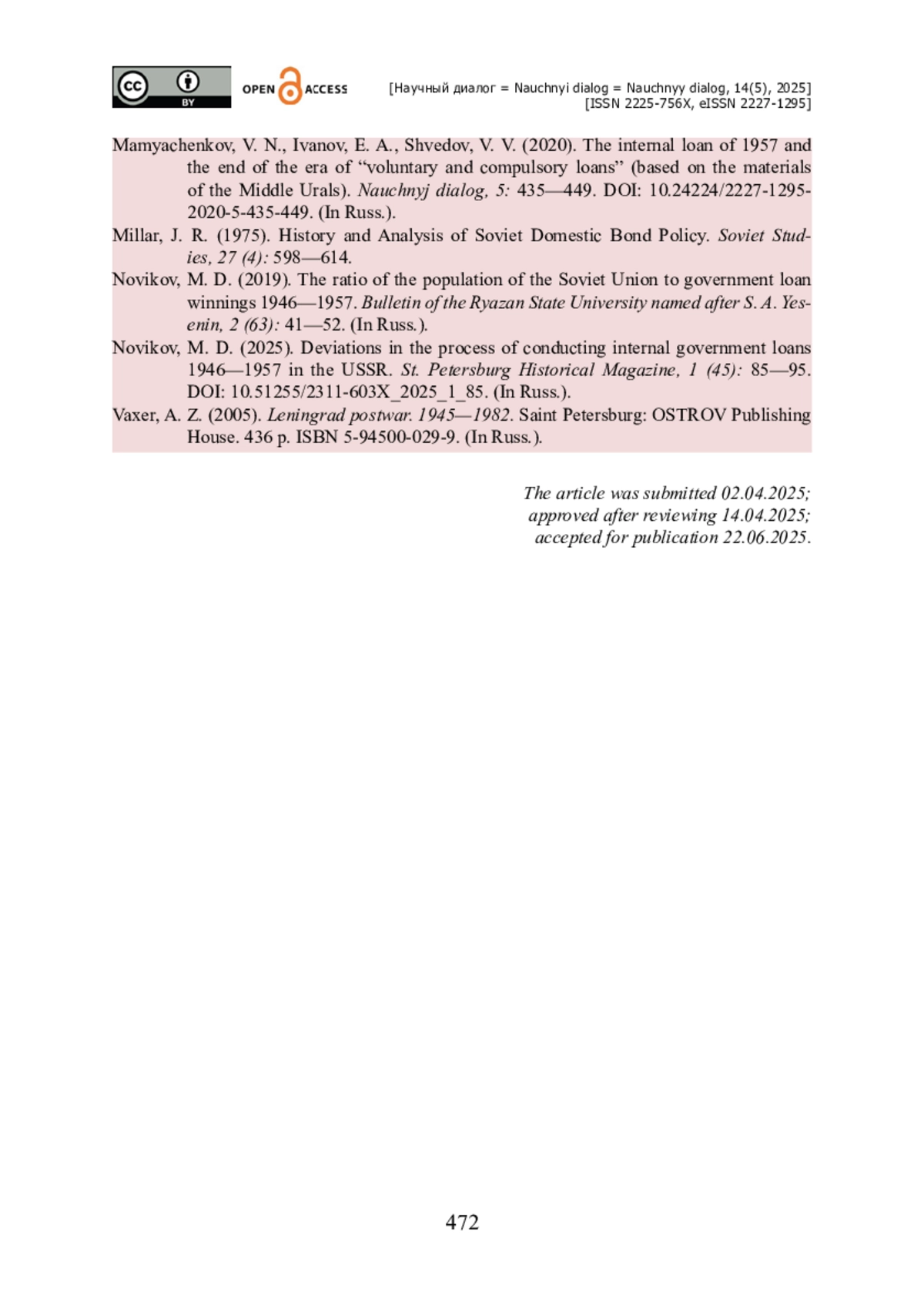 10. Новиков М. Д. Девиации в процессе проведения внутренних государственных займов 1946-1957 годов в СССР / М. Д. Новиков // Петербургский исторический журнал. - 2025. - № 1 (45). - С. 85-95. - https://doi.org/10.51255/2311-603X_2025_1_85.