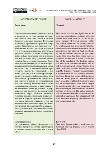 Статья посвящена оценке значения доходов и расходов по государственным внутренним займам 1946—1957 годов в личных бюджетах советских граждан. В качестве источников привлечены архивные доку менты. Установлено, что органами государственной власти детально изучались структура подписки граждан, поступление средств в бюджеты, а также суммы расходов на займы. Отмечается, что их значение не представлялось как ухудшавшее общий уровень благосостояния населения. Показано, что доходы граждан по займам изучались государственными структурами менее детально, хотя в информационном пространстве количество упоминаний о них росло. Доказано, что в течение рассматриваемого периода в информационном поле происходила трансформация представления сюжетов о займах от «общественного блага» к «личному благополучию», а также увеличивалось внимание к выигрышам и распоряжению этими средствами. Подчеркивается, что, несмотря на формируемый позитивный образ займовых кампаний, граждане искали возможность продать облигации в случаях крайней необходимости. Автор приходит к выводу о том, что экономическое поведение граждан имело ситуативный или реактивный характер, поскольку внимание к этим сюжетам чаще со впадало с активным периодом проведения кампаний.