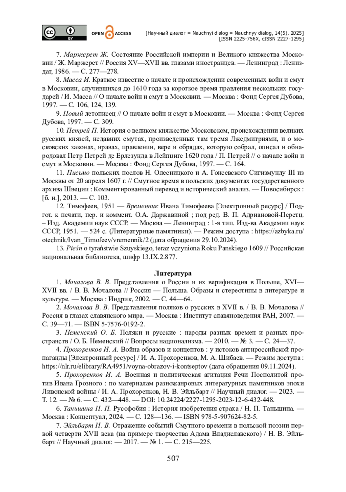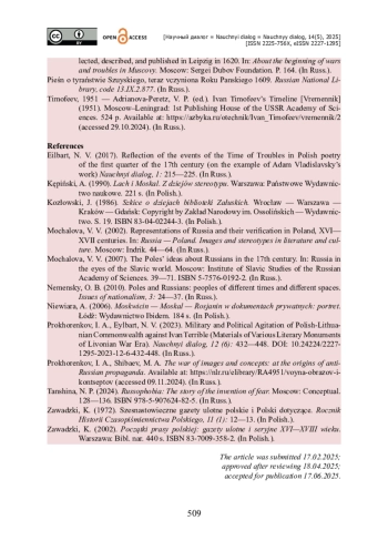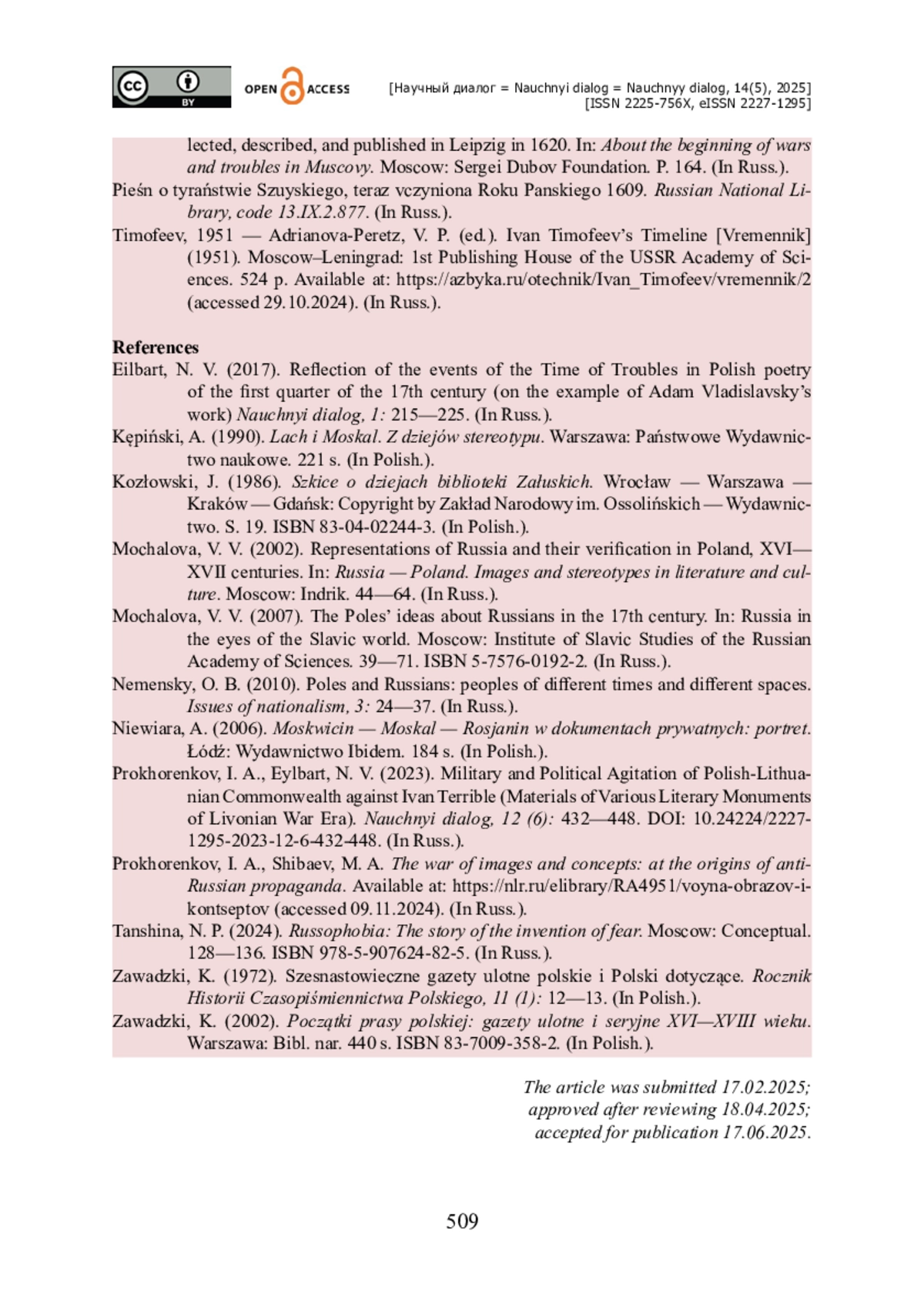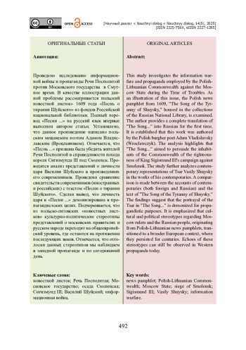 Проведено исследование информационной войны и пропаганды Речи Посполитой против Московского государства в Смутное время. В качестве иллюстрации дан ной проблемы рассматривается польский новостной листок» 1609 года «Песнь о тирании Шуйского» из фондов Российской национальной библиотеки. Полный пере вод «Песни…» на русский язык впервые выполнен автором статьи. Установлено, что данное произведение написано польским мещанским поэтом Адамом Владиславским (Вроцлавчиком). Отмечается, что «Песнь…» призвана была убедить жителей Речи Посполитой в справедливости похода короля Сигизмунда III под Смоленск. Про водится анализ представлений о личности царя Василия Шуйского в произведениях его современников. Проведено сравнение свидетельств современников (иностранных и российских) с текстом «Песни о тирании Шуйского». Сделан вывод, что личность царя в «Песни…» демонизирована в пропагандистских целях. Подчеркивается, что из польско-литовских «новостных листков» культурно-политические стереотипы представлений о московских правителях и русском народе переходят на общеевропейский уровень, где остаются на протяжении последующих веков. Отмечается, что отголоски данных стереотипов мы наблюдаем в западной пропаганде и по сегодняшний день.