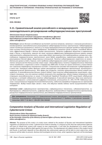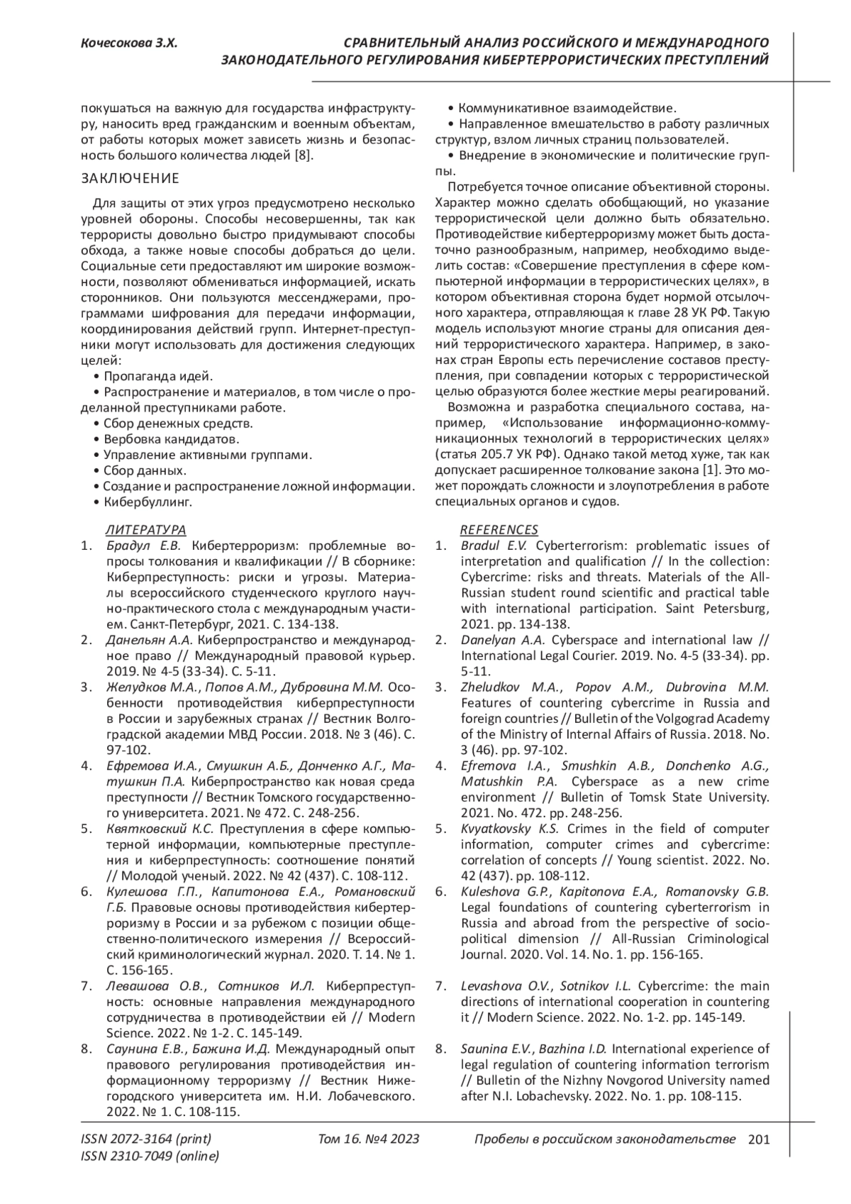 6. Кулешова Г.П., Капитонова Е.А., Романовский Г.Б. Правовые основы противодействия кибертерроризму в России и за рубежом с позиции общественно-политического измерения // Всероссийский криминологический журнал. 2020. Т. 14. № 1. С. 156-165. EDN: GMWAWG
