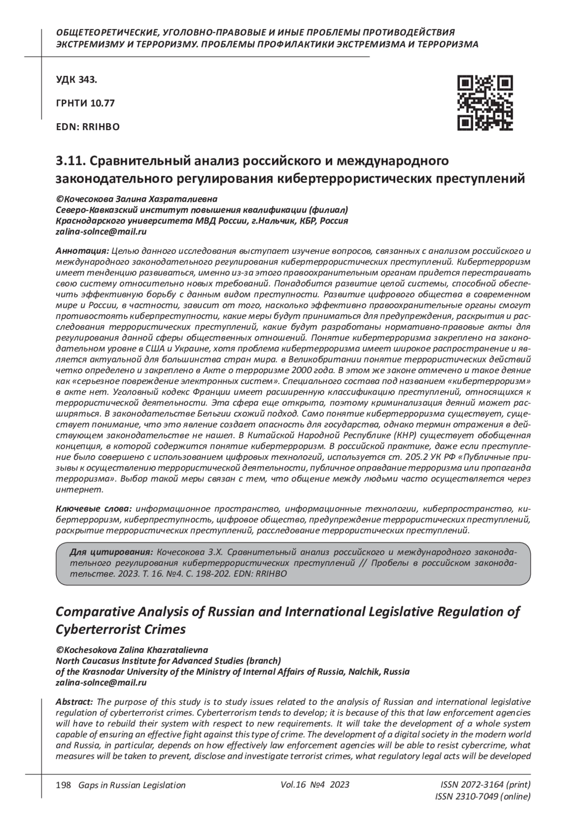 Целью данного исследования выступает изучение вопросов, связанных с анализом российского и международного законодательного регулирования кибертеррористических преступлений. Кибертерроризм имеет тенденцию развиваться, именно из-за этого правоохранительным органам придется перестраивать свою систему относительно новых требований. Понадобится развитие целой системы, способной обеспечить эффективную борьбу с данным видом преступности. Развитие цифрового общества в современном мире и России, в частности, зависит от того, насколько эффективно правоохранительные органы смогут противостоять киберпреступности, какие меры будут приниматься для предупреждения, раскрытия и расследования террористических преступлений, какие будут разработаны нормативно-правовые акты для регулирования данной сферы общественных отношений. Понятие кибертерроризма закреплено на законодательном уровне в США и Украине, хотя проблема кибертерроризма имеет широкое распространение и является актуальной для большинства стран мира. в Великобритании понятие террористических действий четко определено и закреплено в Акте о терроризме 2000 года. В этом же законе отмечено и такое деяние как «серьезное повреждение электронных систем». Специального состава под названием «кибертерроризм» в акте нет. Уголовный кодекс Франции имеет расширенную классификацию преступлений, относящихся к террористической деятельности. Эта сфера еще открыта, поэтому криминализация деяний может расширяться. В законодательстве Бельгии схожий подход. Само понятие кибертерроризма существует, существует понимание, что это явление создает опасность для государства, однако термин отражения в действующем законодательстве не нашел. В Китайской Народной Республике (КНР) существует обобщенная концепция, в которой содержится понятие кибертерроризм. В российской практике, даже если преступление было совершено с использованием цифровых технологий, используется ст. 205.2 УК РФ «Публичные призывы к осуществлению террористической деятельности, публичное оправдание терроризма или пропаганда терроризма». Выбор такой меры связан с тем, что общение между людьми часто осуществляется через интернет.