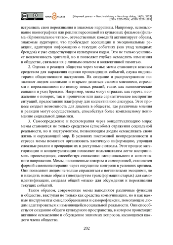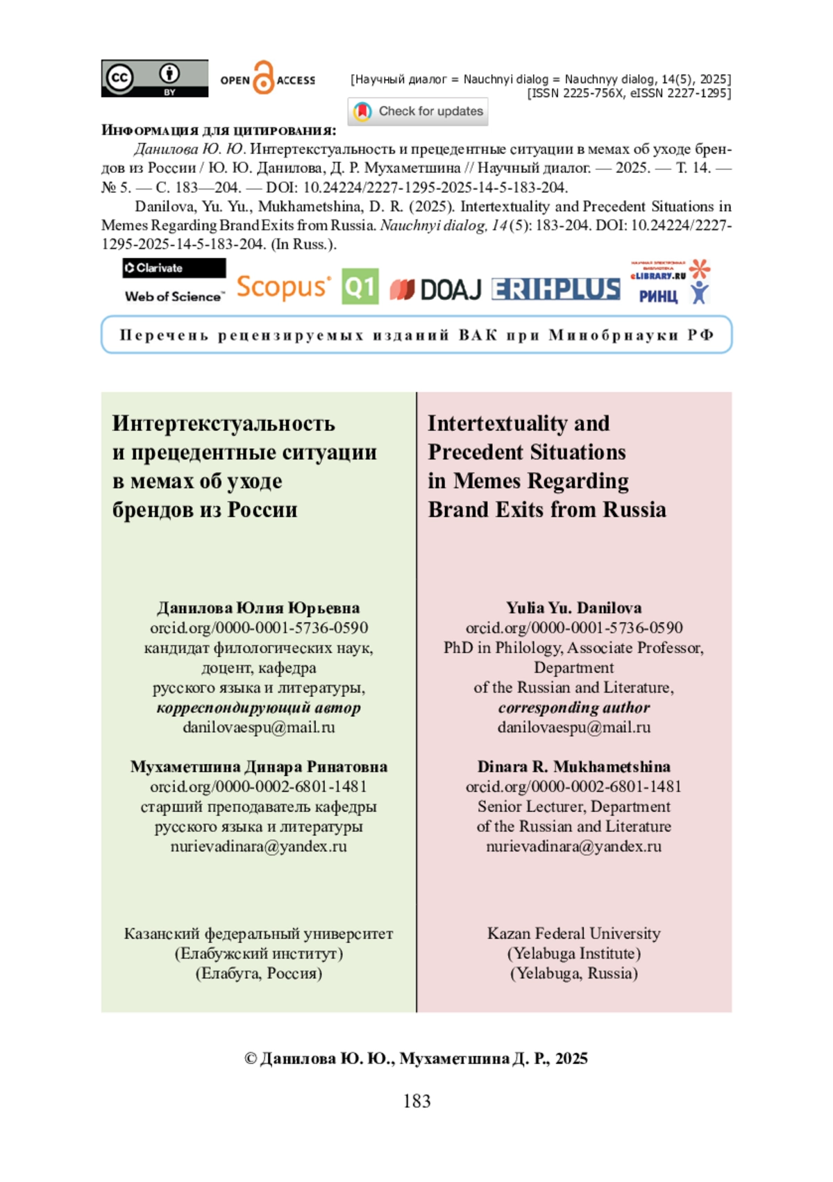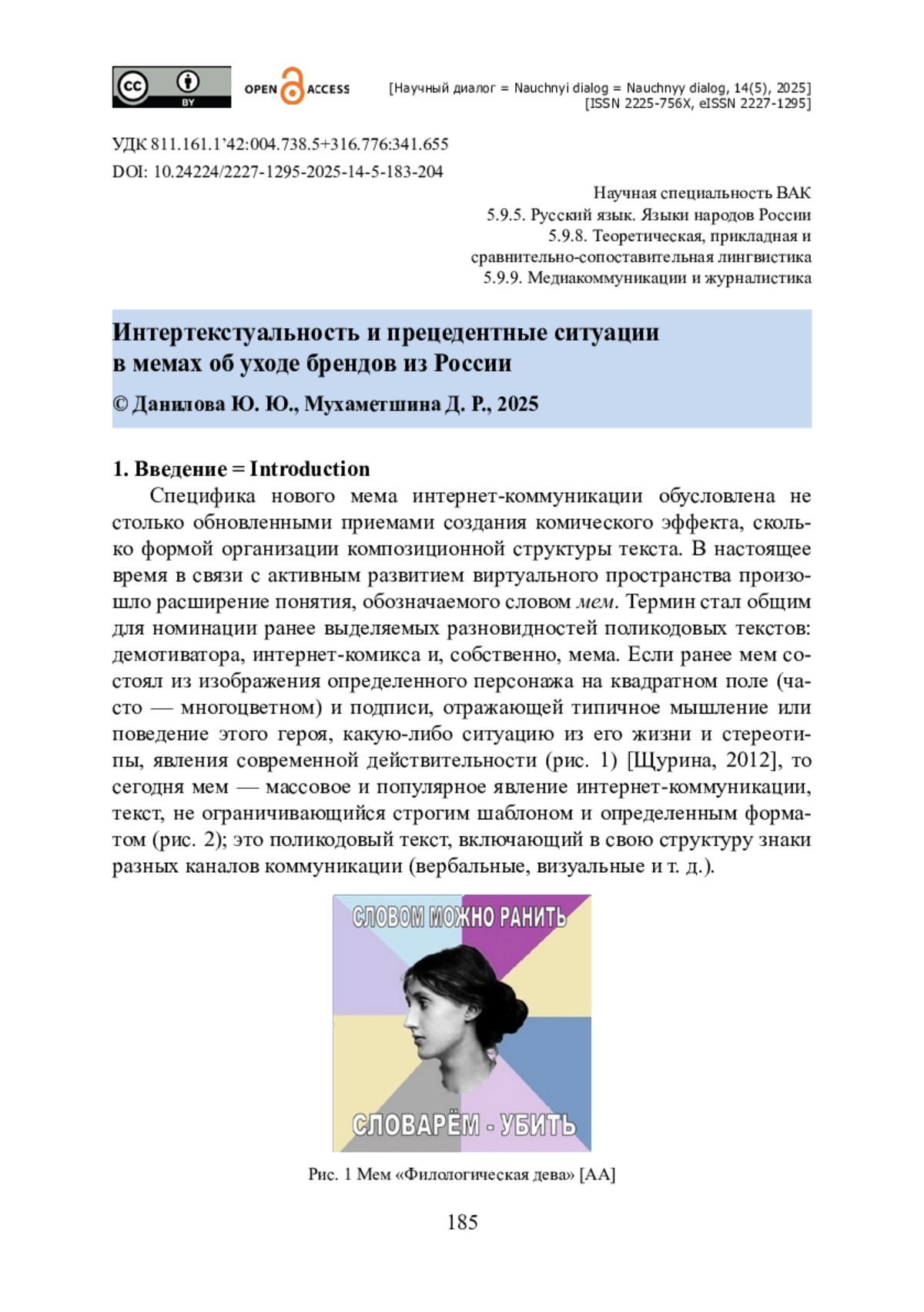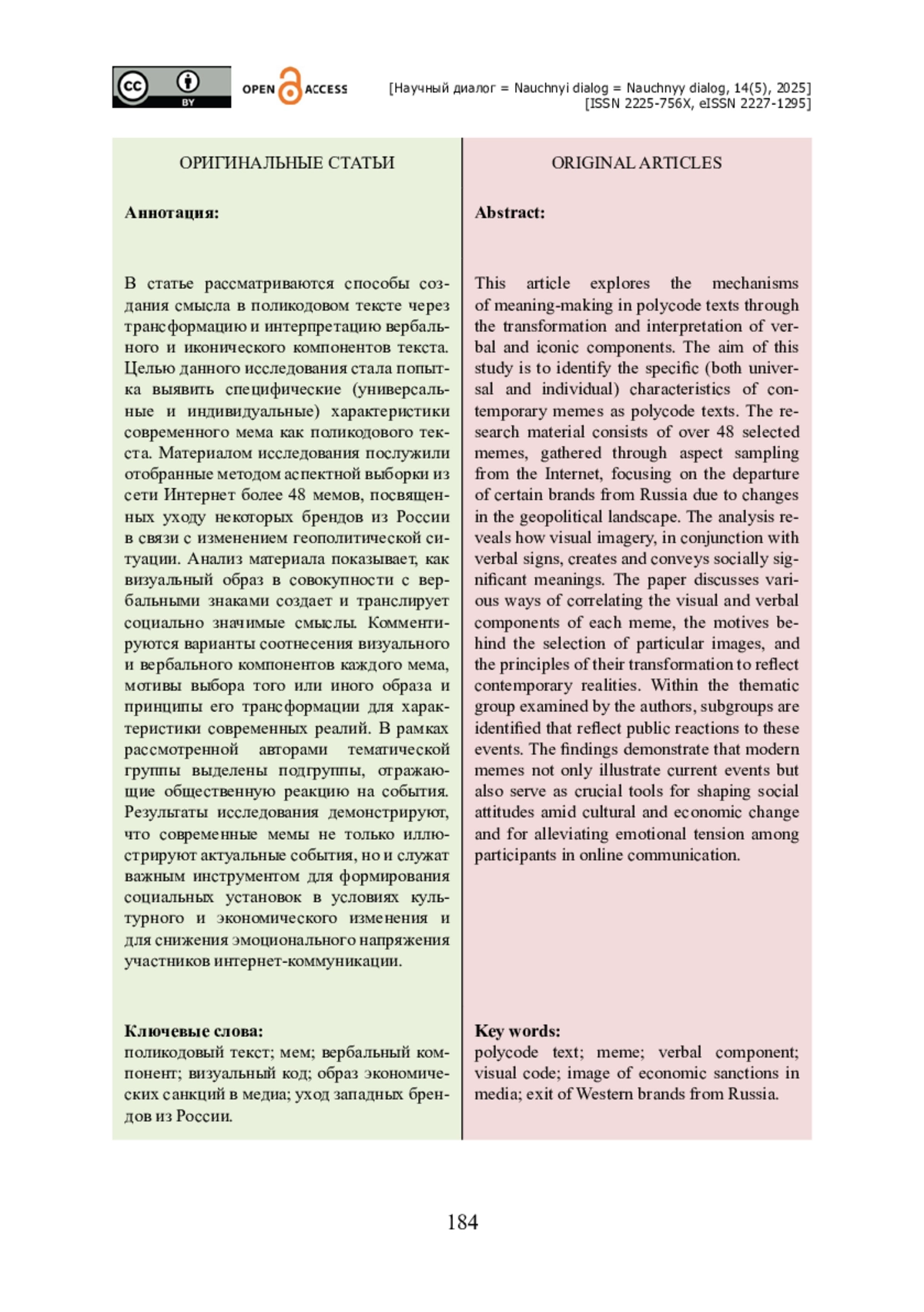 В статье рассматриваются способы создания смысла в поликодовом тексте через трансформацию и интерпретацию вербального и иконического компонентов текста. Целью данного исследования стала попытка выявить специфические (универсальные и индивидуальные) характеристики современного мема как поликодового текста. Материалом исследования послужили отобранные методом аспектной выборки из сети Интернет более 48 мемов, посвященных уходу некоторых брендов из России в связи с изменением геополитической ситуации. Анализ материала показывает, как визуальный образ в совокупности с вербальными знаками создает и транслирует социально значимые смыслы. Комментируются варианты соотнесения визуального и вербального компонентов каждого мема, мотивы выбора того или иного образа и принципы его трансформации для характеристики современных реалий. В рамках рассмотренной авторами тематической группы выделены подгруппы, отражающие общественную реакцию на события. Результаты исследования демонстрируют, что современные мемы не только иллюстрируют актуальные события, но и служат важным инструментом для формирования социальных установок в условиях культурного и экономического изменения и для снижения эмоционального напряжения участников интернет-коммуникации.