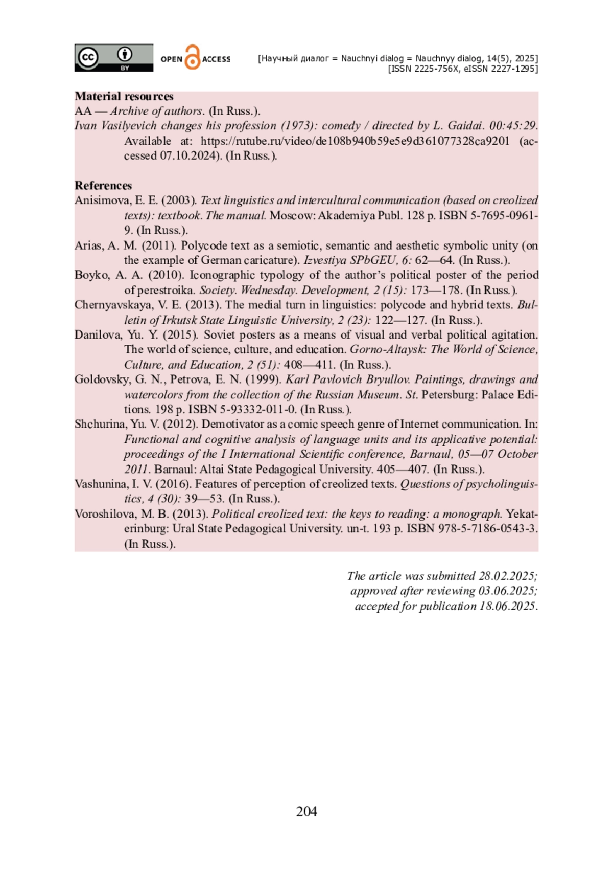 4. Вашунина И. В. Особенности восприятия креолизованных текстов / И. В. Вашунина // Вопросы психолингвистики. - 2016. - № 4 (30) - C. 39-53.