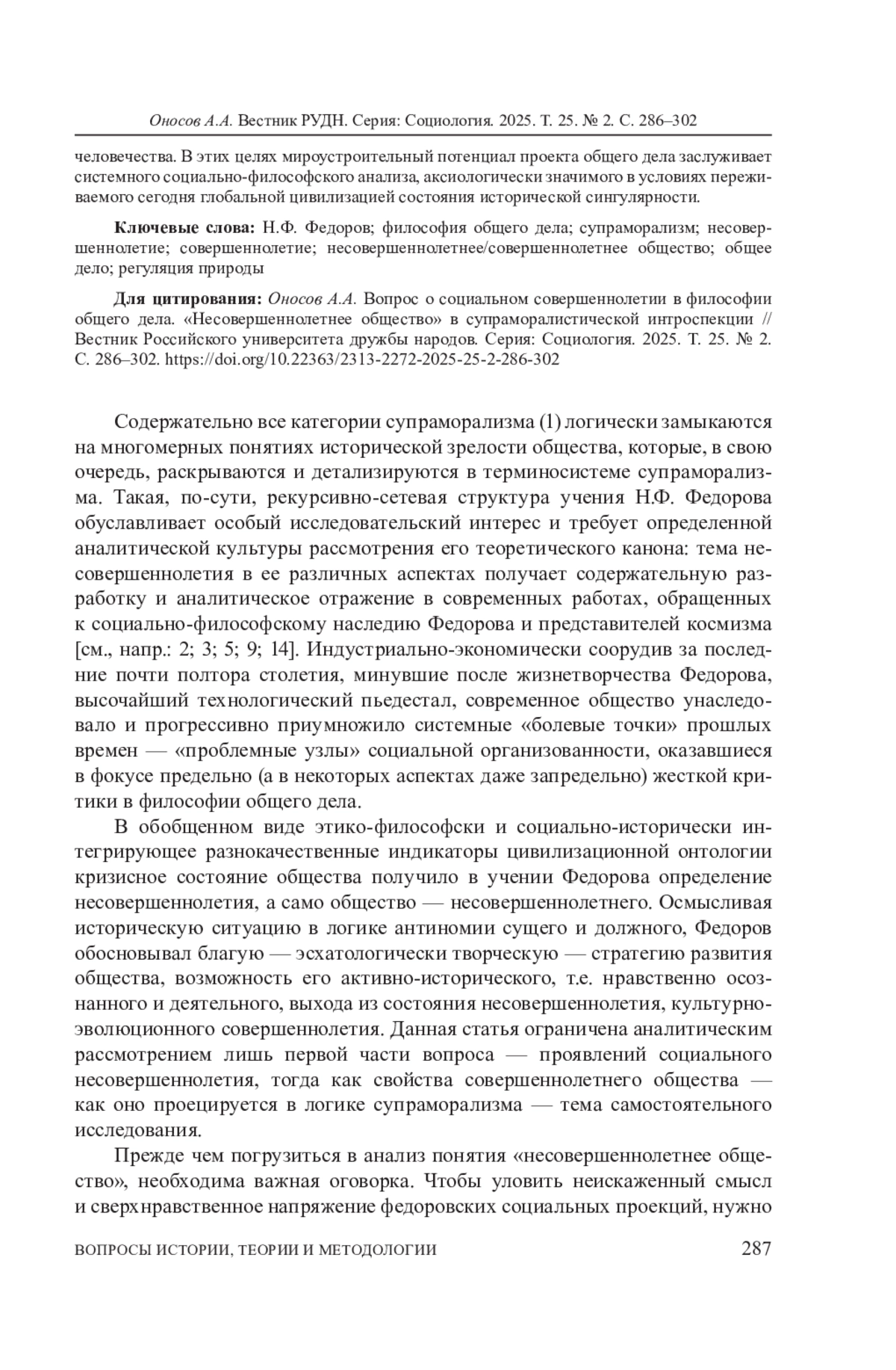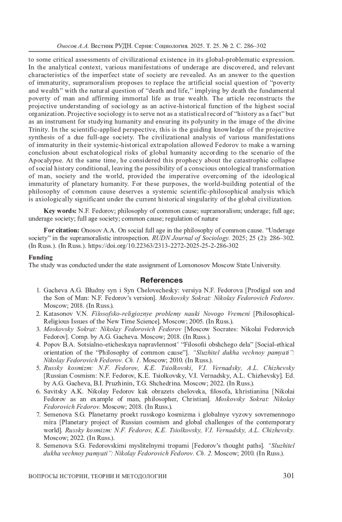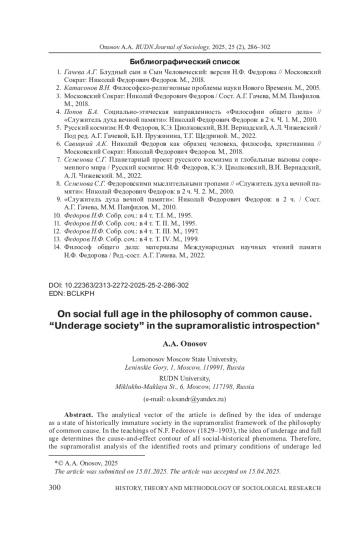 Содержательно все категории супраморализма (1) логически замыкаются на многомерных понятиях исторической зрелости общества, которые, в свою очередь, раскрываются и детализируются в терминосистеме супраморализма. Такая, по- сути, рекурсивно- сетевая структура учения Н. Ф. Федорова обуславливает особый исследовательский интерес и требует определенной аналитической культуры рассмотрения его теоретического канона: тема несовершеннолетия в ее различных аспектах получает содержательную разработку и аналитическое отражение в современных работах, обращенных к социально- философскому наследию Федорова и представителей космизма [см., напр.: 2; 3; 5; 9; 14].