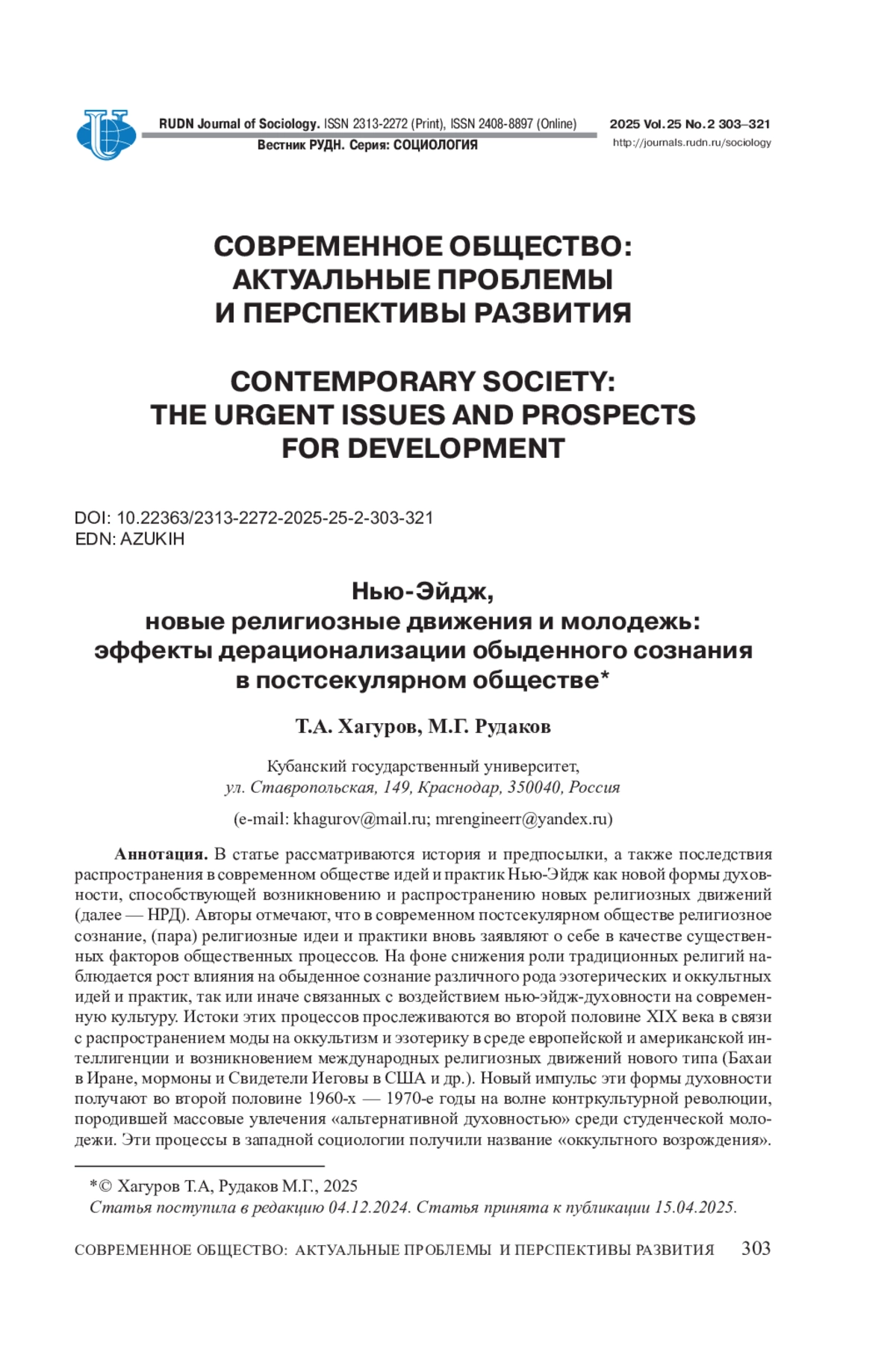 В статье рассматриваются история и предпосылки, а также последствия распространения в современном обществе идей и практик Нью-Эйдж как новой формы духовности, способствующей возникновению и распространению новых религиозных движений (далее - НРД). Авторы отмечают, что в современном постсекулярном обществе религиозное сознание, (пара) религиозные идеи и практики вновь заявляют о себе в качестве существенных факторов общественных процессов. На фоне снижения роли традиционных религий наблюдается рост влияния на обыденное сознание различного рода эзотерических и оккультных идей и практик, так или иначе связанных с воздействием нью-эйдж-духовности на современную культуру. Истоки этих процессов прослеживаются во второй половине XIX века в связи с распространением моды на оккультизм и эзотерику в среде европейской и американской интеллигенции и возникновением международных религиозных движений нового типа (Бахаи в Иране, мормоны и Свидетели Иеговы в США и др.). Новый импульс эти формы духовности получают во второй половине 1960-х - 1970-е годы на волне контркультурной революции, породившей массовые увлечения «альтернативной духовностью» среди студенческой молодежи. Эти процессы в западной социологии получили название «оккультного возрождения». В статье также рассмотрены особенности распространения нетрадиционной духовности в России - от возникновения соответствующей моды в среде интеллигенции в 1970-е годы до массовой волны эзотерики, захлестнувшей российское общество в 1990-е годы. Говоря о современном состоянии проблемы, авторы подчеркивают роль Интернета в распространении и оформлении новых религиозных движений, общин и идеологий, отмечают сетевой характер и отсутствие четких институциональных границ у возникающих сегодня (пара) религиозных сообществ. В статье приведены основания классификации НРД и обозначено их влияние на различные сферы культуры и массового сознания, в частности, это нарастающая дерационализация обыденного сознания, эклектично совмещающего в себе элементы научной, религиозной и оккультной картин мира.