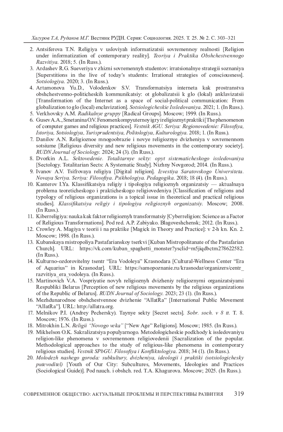 7. Данилов А.Н. Религиозное многообразие и новые религиозные движения в современном социуме // Вестник РУДН. Серия: Социология. 2024. Т. 24. № 3. EDN: FZKLOA