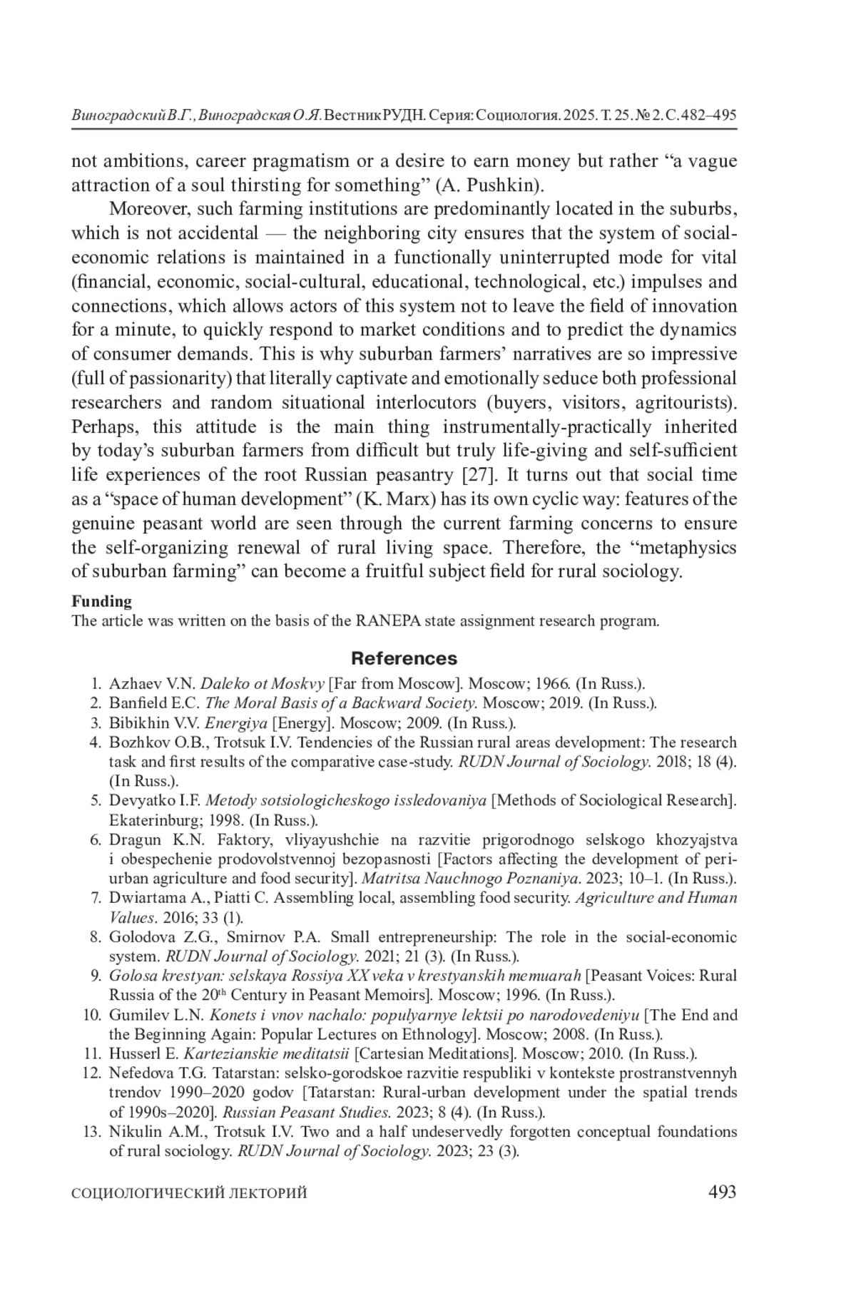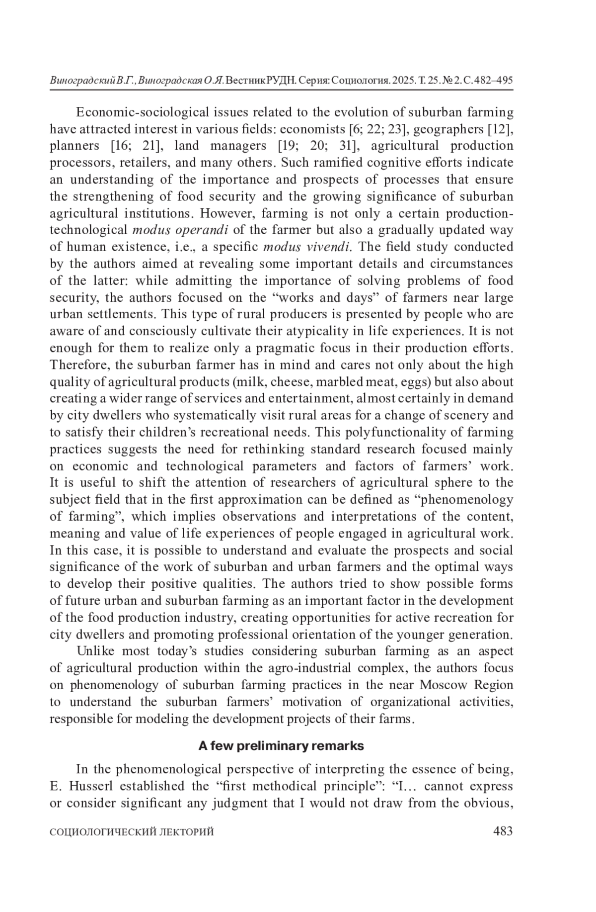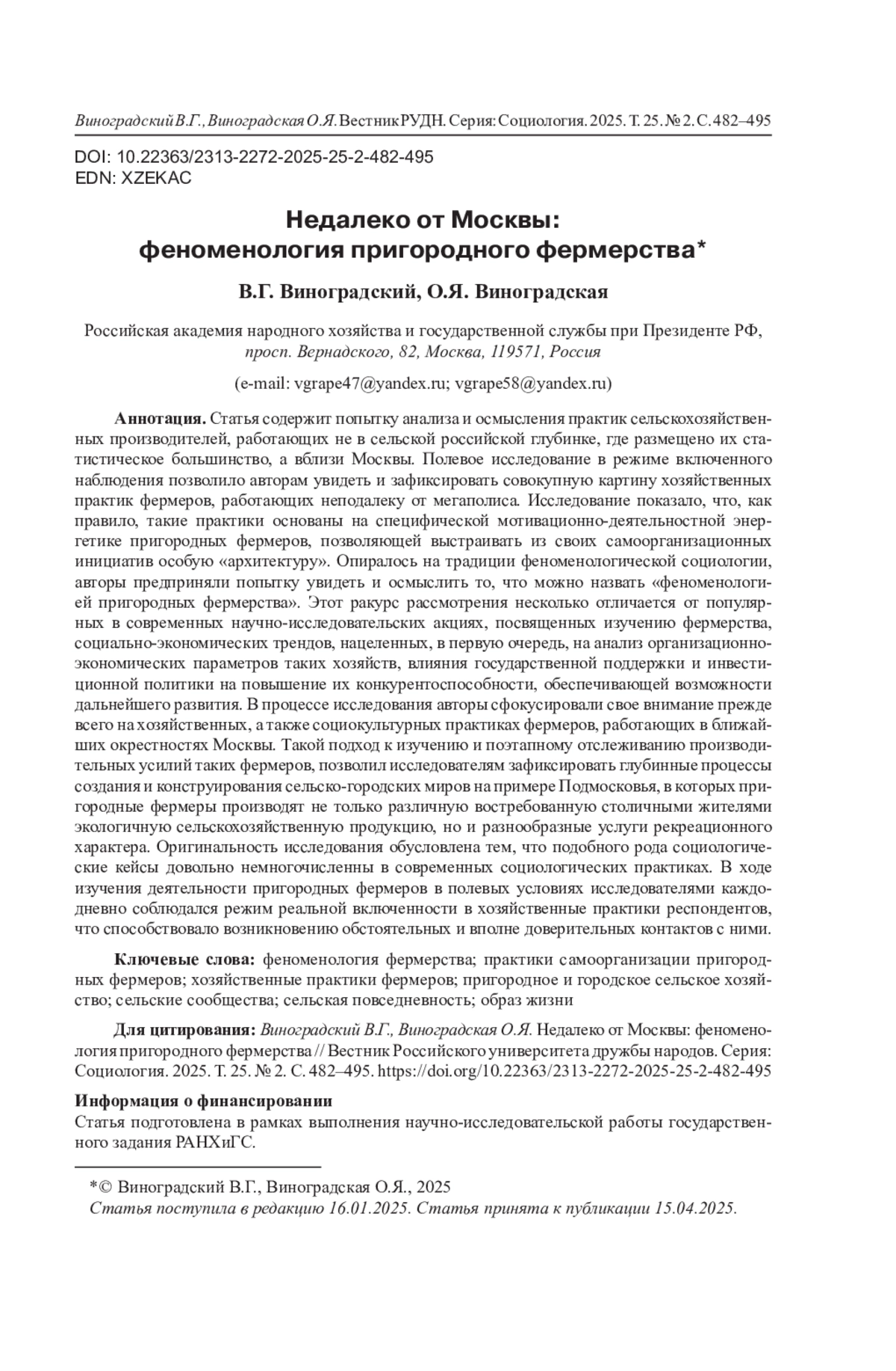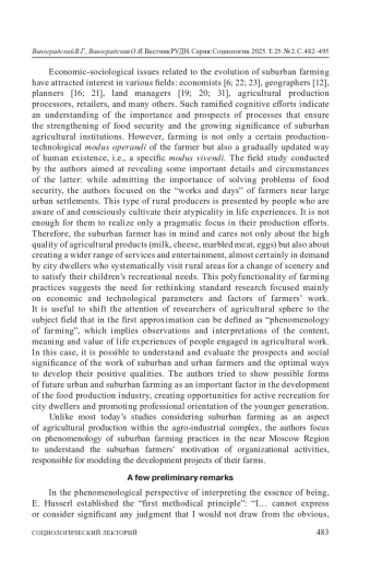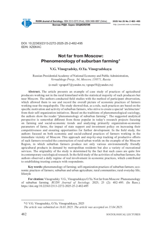 ВИНОГРАДСКИЙ В. Г., ВИНОГРАДСКАЯ О. Я. НЕДАЛЕКО ОТ МОСКВЫ: ФЕНОМЕНОЛОГИЯ ПРИГОРОДНОГО ФЕРМЕРСТВА // ВЕСТНИК РОССИЙСКОГО УНИВЕРСИТЕТА ДРУЖБЫ НАРОДОВ. СЕРИЯ: СОЦИОЛОГИЯ. 2025. Т. 25 № 2