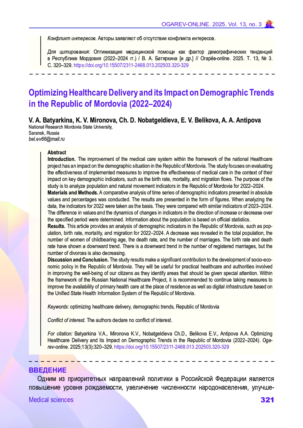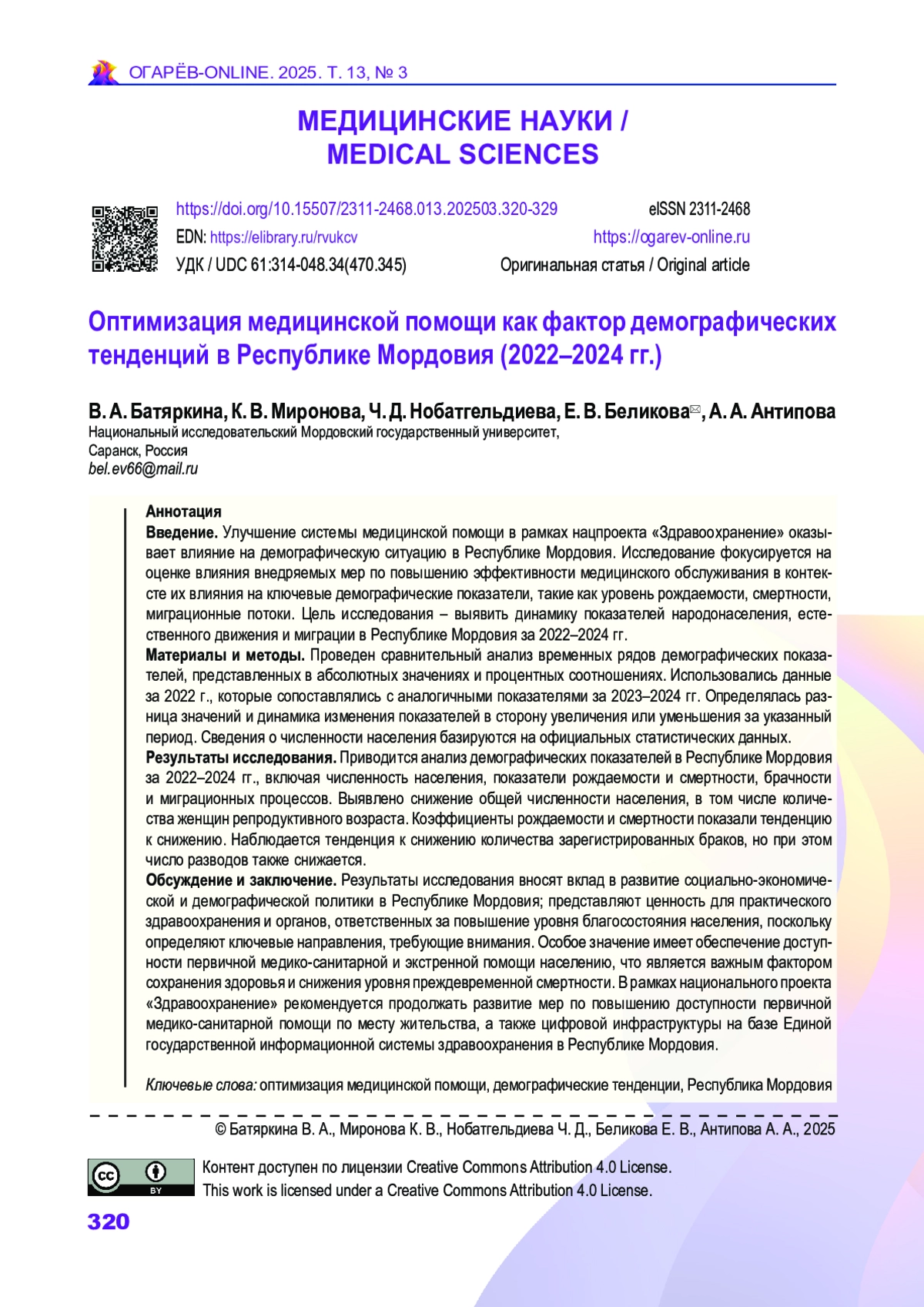 Введение. Улучшение системы медицинской помощи в рамках нацпроекта «Здравоохранение» оказывает влияние на демографическую ситуацию в Республике Мордовия. Исследование фокусируется на оценке влияния внедряемых мер по повышению эффективности медицинского обслуживания в контексте их влияния на ключевые демографические показатели, такие как уровень рождаемости, смертности, миграционные потоки. Цель исследования – выявить динамику показателей народонаселения, естественного движения и миграции в Республике Мордовия за 2022–2024 гг.