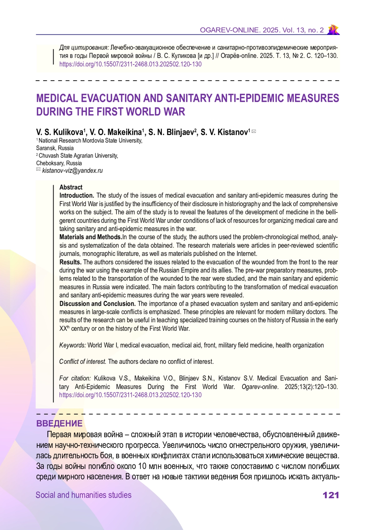 7. Асташов А. Б. Мобилизация и санитария в тылу русской армии в 1914-1918 годах: социально-экологический анализ // Вестник Пермского университета. История. 2021. № 2 (53). С. 27-37. DOI: 10.17072/2219-3111-2021-2-27-37