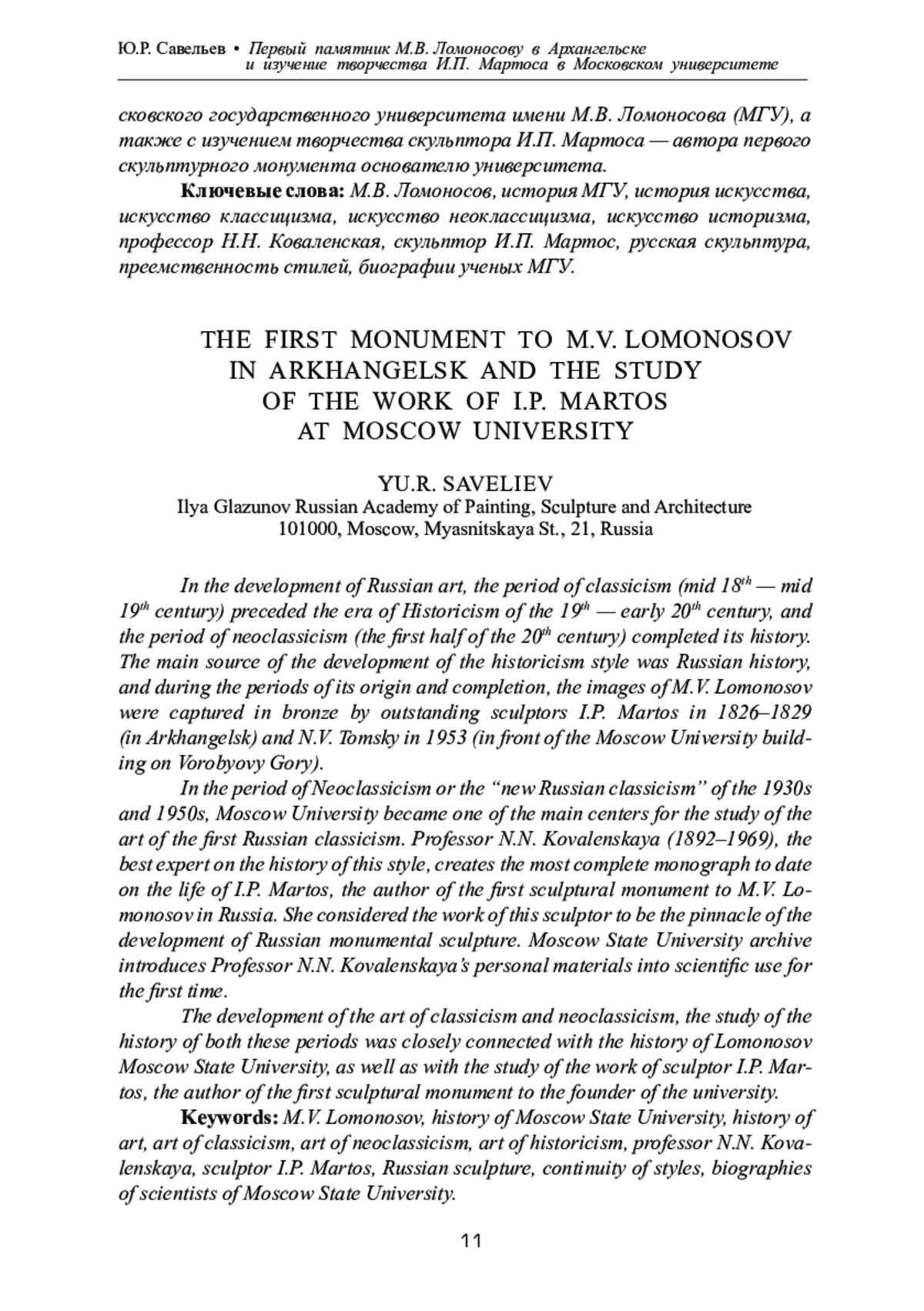 В развитии русского искусства период классицизма (середина XVIII - середина XIX в.) предшествовал эпохе историзма XIX - начала ХХ в., а период неоклассицизма (первая половина ХХ в.) завершал ее историю. Главным источником развития стиля историзма была отечественная история, и в периоды его зарождения и завершения образы М. В. Ломоносова были запечатлены в бронзе выдающимися скульпторами И. П. Мартосом в 1826-1829 гг. (в Архангельске) и Н. В. Томским в 1953 г. (перед зданием Московского университета на Воробьевых горах). В период неоклассицизма или «нового русского классицизма» 1930-1950-х годов Московский университет становится одним из главных центров изучения искусства первого русского классицизма. Профессор Н. Н. Коваленская (1892-1969) - крупнейший специалист по истории этого стиля - создает наиболее полную до сегодняшнего дня монографию о жизненном пути И. П. Мартоса - автора первого скульптурного памятника М. В. Ломоносову в России. Творчество этого ваятеля она считала вершиной развития русской монументальной скульптуры. Впервые вводятся в научный обиход личные материалы профессора Н. Н. Коваленской из архива МГУ. Развитие искусства классицизма и неоклассицизма, изучение истории обоих этих периодов была теснейшим образом связана с историей Московского государственного университета имени М. В. Ломоносова (МГУ), а также с изучением творчества скульптора И. П. Мартоса - автора первого скульптурного монумента основателю университета.