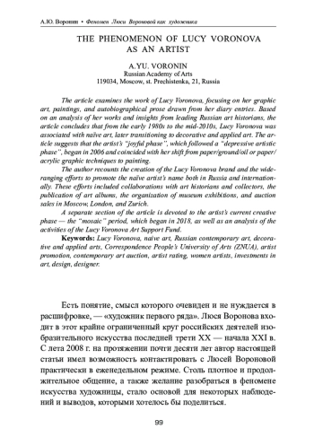 В статье рассматривается творчество Люси Вороновой — графика, живопись, а также автобиографическая проза — дневниковые записи художницы. На основе анализа ее графических и живописных работ и позиции ведущих российских искусствоведов делается вывод о том, что с начала 1980-х годов и до второй половины 2010-х Люся Воронова относится к наивным художникам, после — к художникам декоративно-прикладного искусства. При этом утверждается, что «радостный» период в творчестве художницы, пришедший на смену «депрессивному», начался в 2006 г. и совпал с переходом от графики в технике бумага/грунт/масло или бумага/акрил к живописи. Автор делится историей создания бренда «Люся Воронова», комплексом проведенных мероприятий по продвижению имени наивной художницы в России и за рубежом: работой с искусствоведами и коллекционерами, подготовкой художественных альбомов, организацией музейных выставок и аукционных продаж в Москве, Лондоне и Цюрихе. Отдельный фрагмент статьи посвящен исследованию современного этапа творческой деятельности художницы — «мозаичному» периоду, начавшемуся в 2018 г., а также анализу работы Фонда поддержки искусства Люси Вороновой