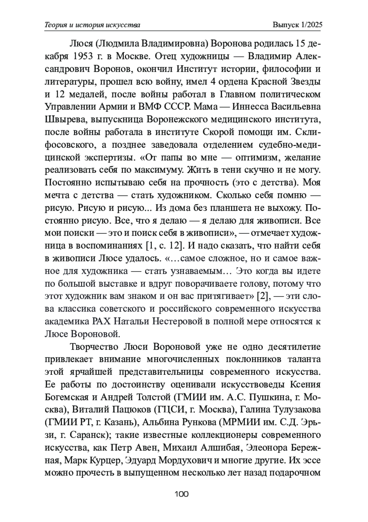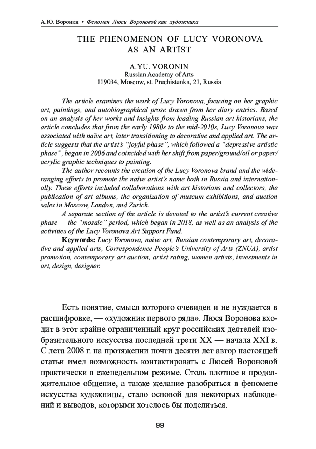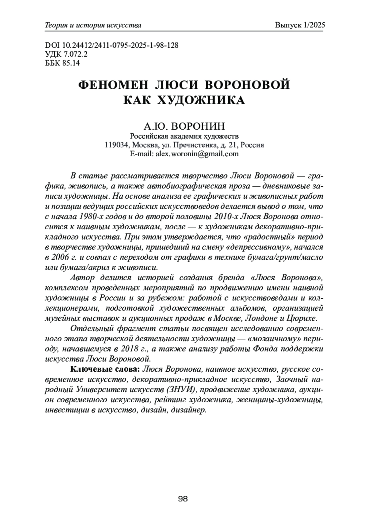 ВОРОНИН А. Ю. ФЕНОМЕН ЛЮСИ ВОРОНОВОЙ КАК ХУДОЖНИКА // ТЕОРИЯ И ИСТОРИЯ ИСКУССТВА. 2025. № 1